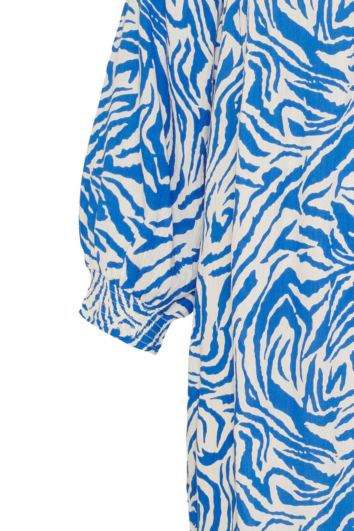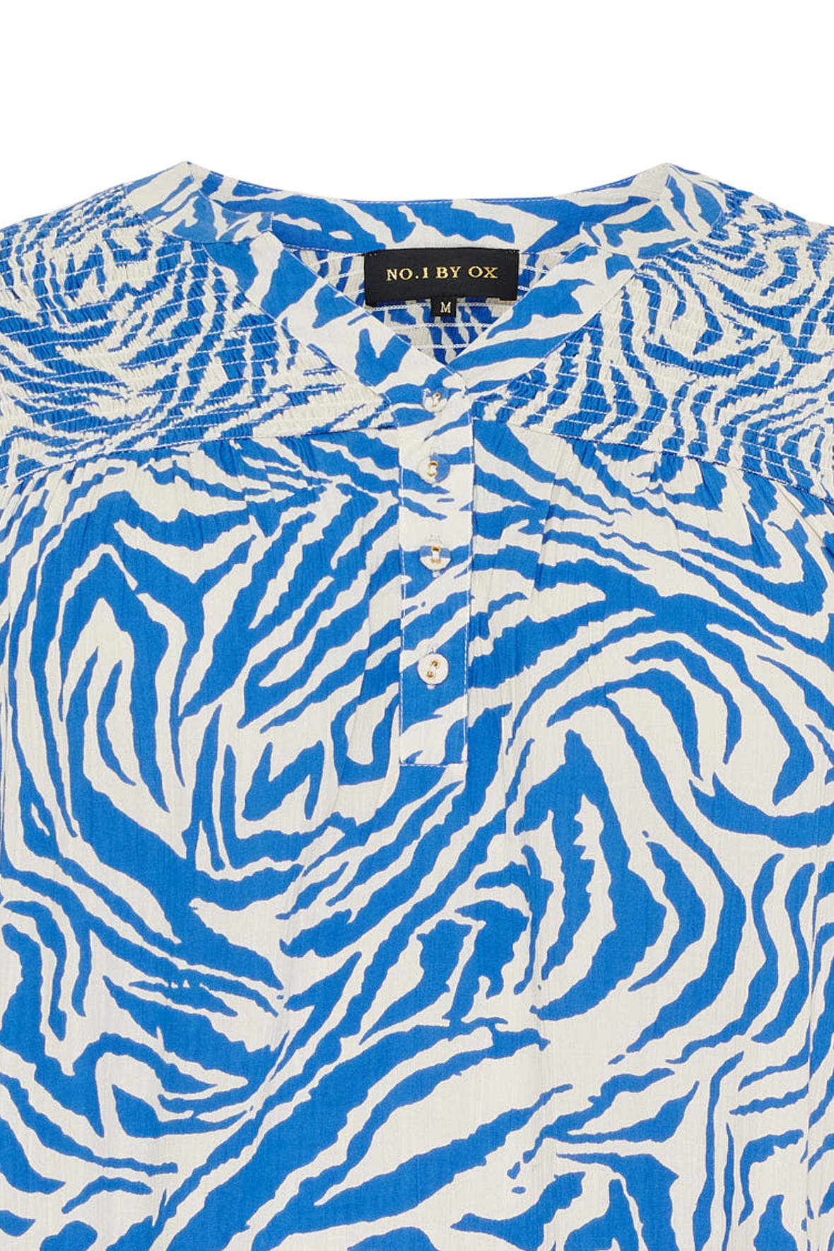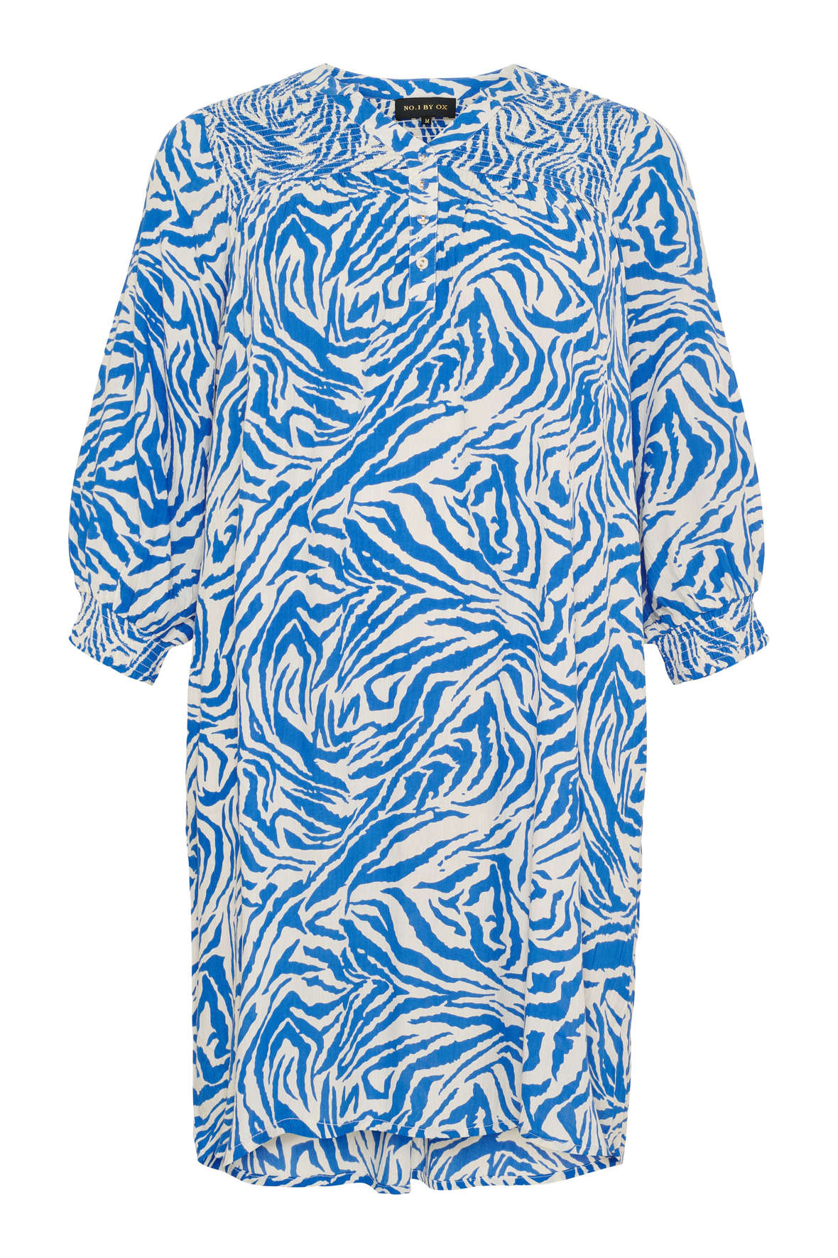 Forårs- og sommerkjole fra No.1 by OX lavet til plus piger. Er du lidt træt af sort og hvid når den står på zebraprint skal du prøve den i blå. Den er lavet så den falder løst hele vejen ned, lige fra øvre bryst af. Den har rund halslinje med Kina krave samt har åben V-stolpe og tre stofbetrukne knapper. Og har du allerede luret billederne af har du sikkert set at den har smock på øvre brysttykke samt skuldre, også bag. Fra smockken udgår det løse stoft med små læg. Der er god volumen i ærmer som slutter i 3/4 længde med flot smock manchet der komplimenterer den øvrige smock. Den runder forneden og har lidt mere længde bagtil. Den sidder flot særligt hvis du er til det løse. Den slutter ved læg. Kvaliteten er en let åndbar crepe viskose.