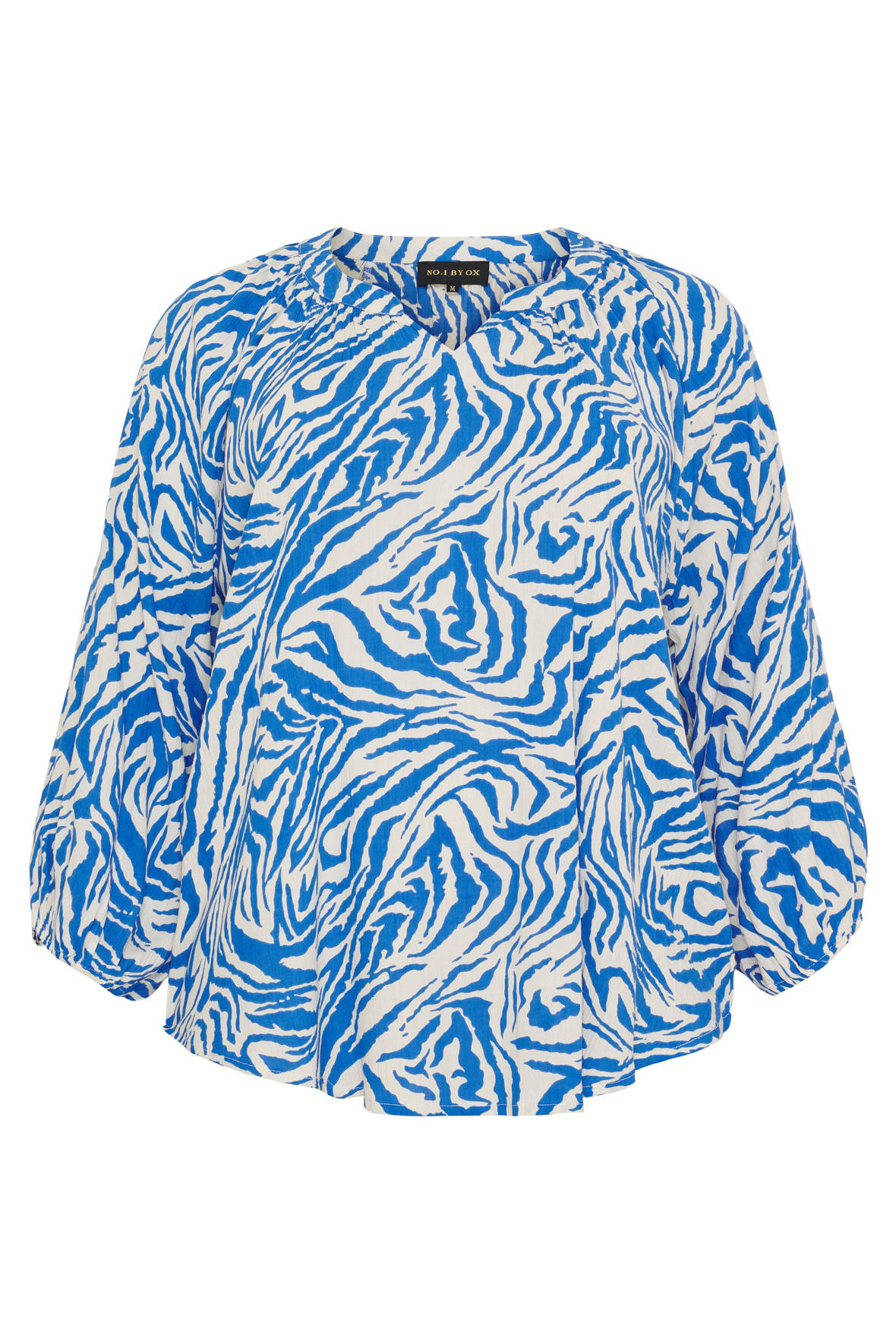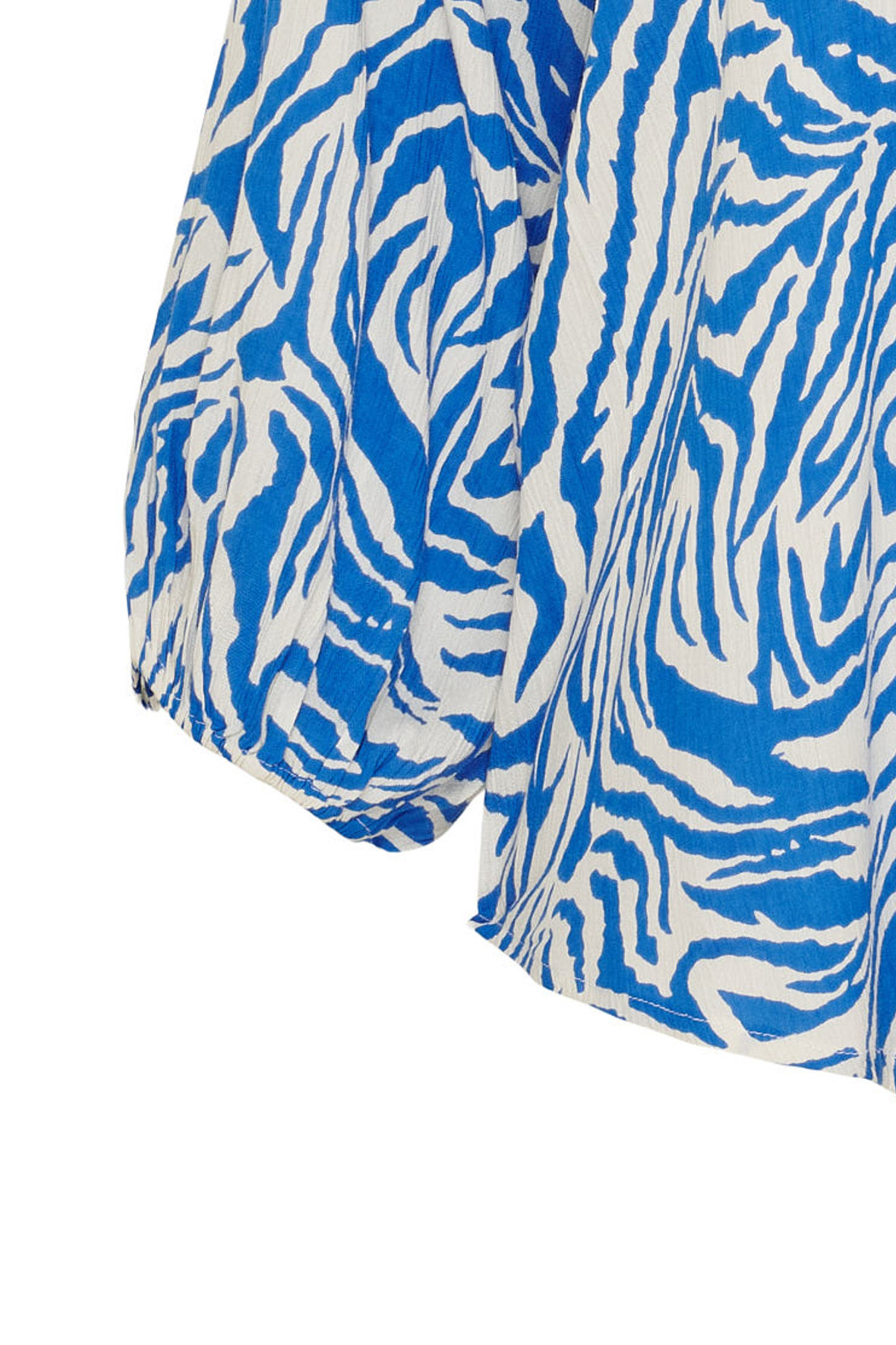 Hvis det af og til skal være nemt at gå i skabet, så er du landet helt rigtig. Tunikablusen her er med 3/4 raglan ærmer med smal elastik, den har et flot blåt zebra print samt er med rund halslinje med åben V-stolpe og langs kanten er der små rynker. Den er løs henover barmen og falder også sådan videre ned. Den runder forneden hvor den er dybest for og bag, det giver dig lidt medvind til længere ben - rent visuelt. Her kommer du nemt til at se godt ud.