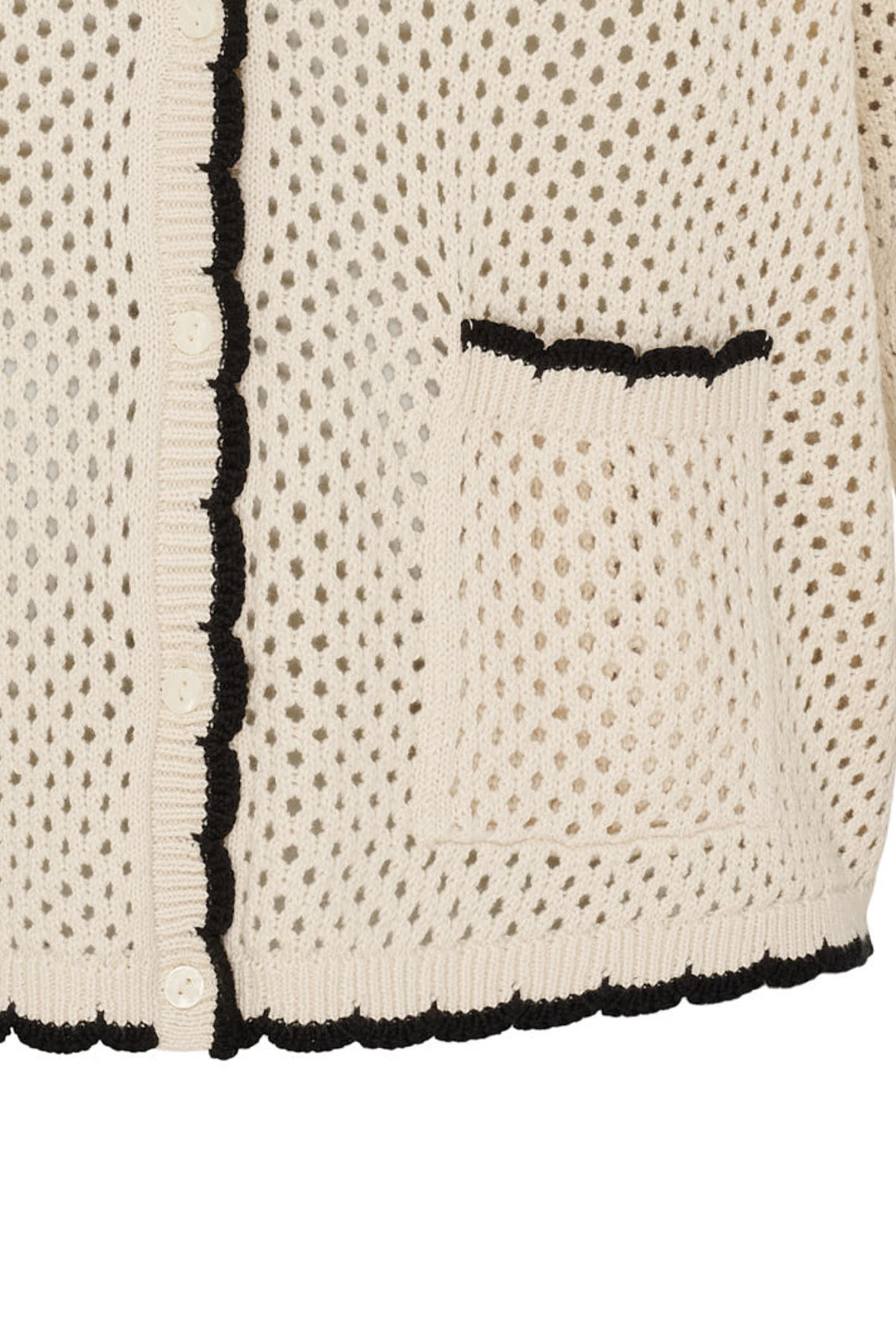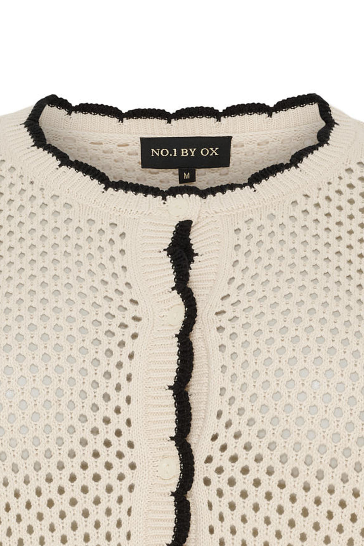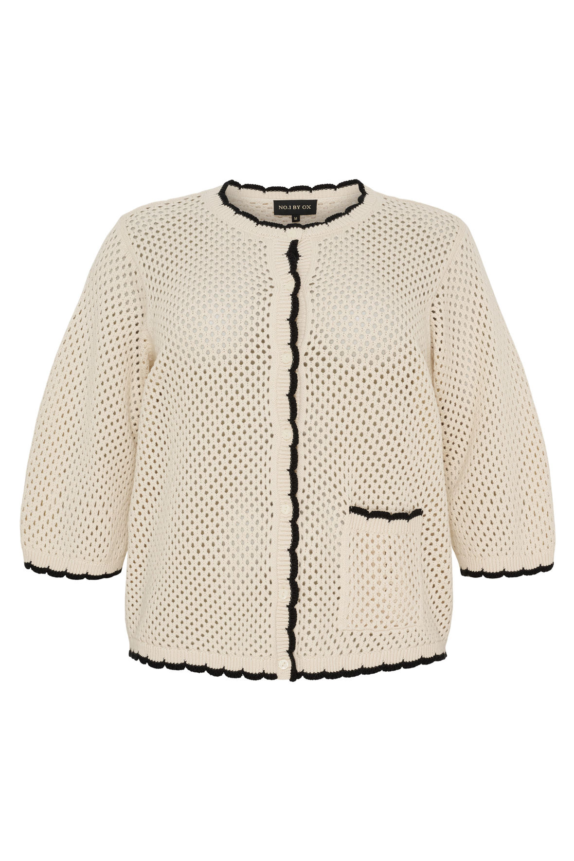 Her er du altså landet på en hulstrikket cardigan der virkelig har et flot elegant design. Ja den leder tankerne hen på Jackie Kennedy. "Klassisk" er et udtryk der ofte bruges, ja faktisk så ofte om noget der slet ikke er det, men det er den her altså i udtryk og snit. Off White/cream i bunden med den smukkeste sorte kant. Med gennemgående knaplukning og 3/4 ærmer. Og, helt personligt synes jeg faktisk det er en flot touch med den lille påsatte lomme. Den er hurigt udsolgt fra hovedlager og vi har kun få tilbage.