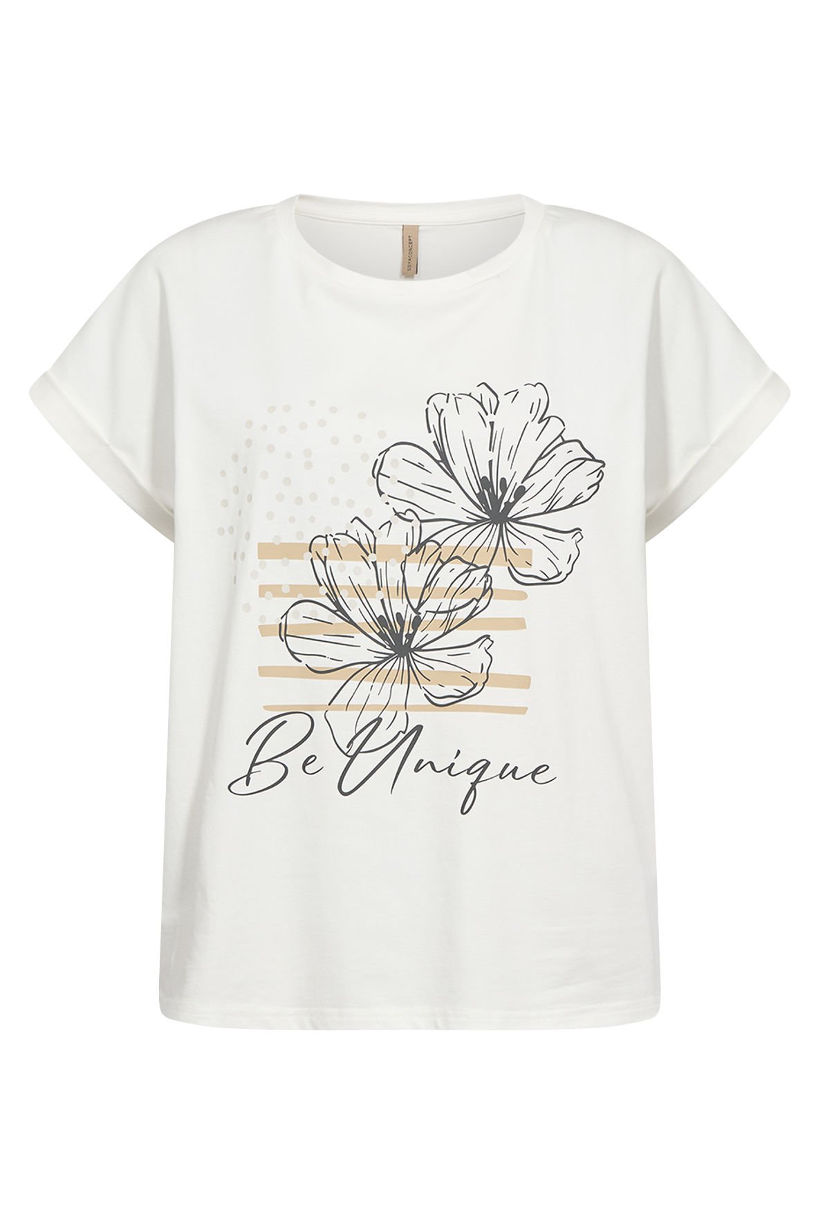 SC-RINA FP 15 T-shirt er fremstillet af 95% økologisk bomuld og 5% elastan og aligevel kan Soya holde prisen i bund. T-shirten har drop down skuldreog fast oprullede korte ærmer, en rund krave og et markant blomster- og stribeprint. Den har løs pasform og god vidde til barmen. For at du bedre kan danne dig et indtryk af str. har jeg her sat billeder ind af den i anden farve der er taget på model.