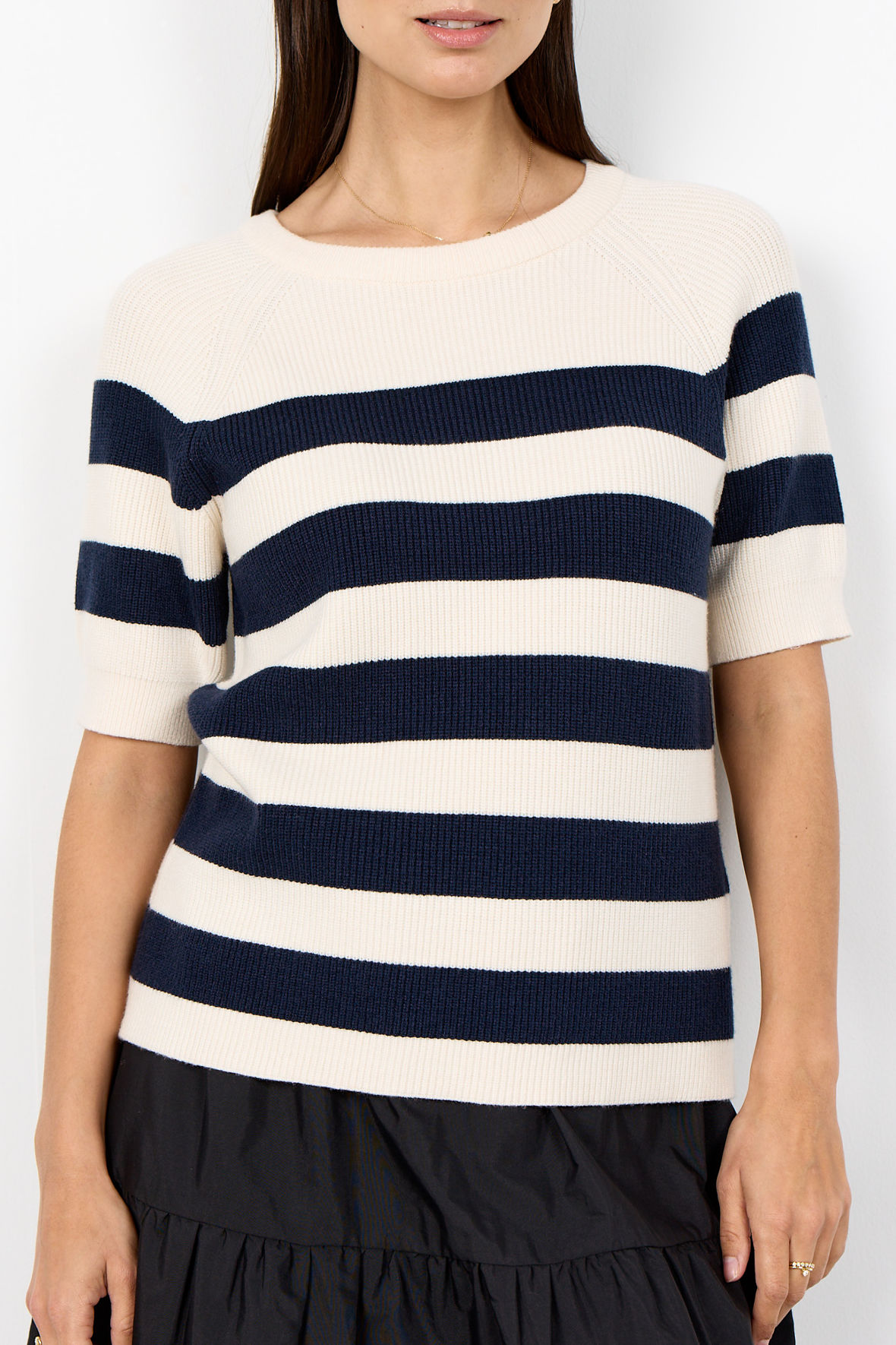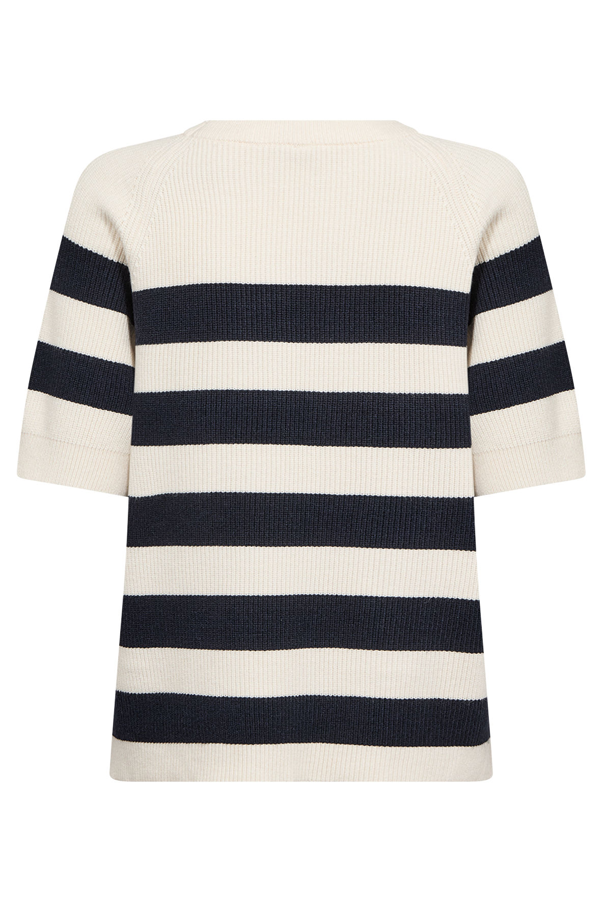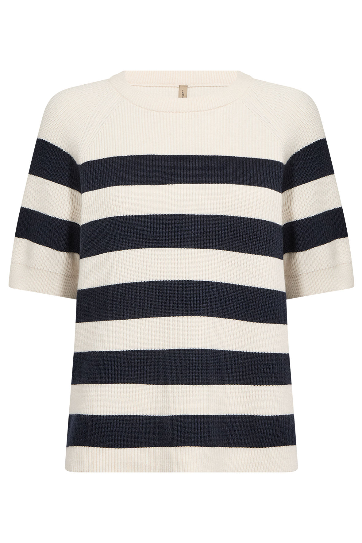 Sc-Kanita Stripe 35 strik pullover består af 50% LENZING™ ECOVERO™-viskose, 27% polyester, 23% nylon. Og, så er der dømt sømands stemning med navy på off w, det er så sommerligt som det kan være. Den har en klassisk rund halsudskæring, korte raglan ærmer og dristige vandrette blok striber. Den er lige en tand kraftigere end en finstrik. Den holder farve, facon og krøller ikke.