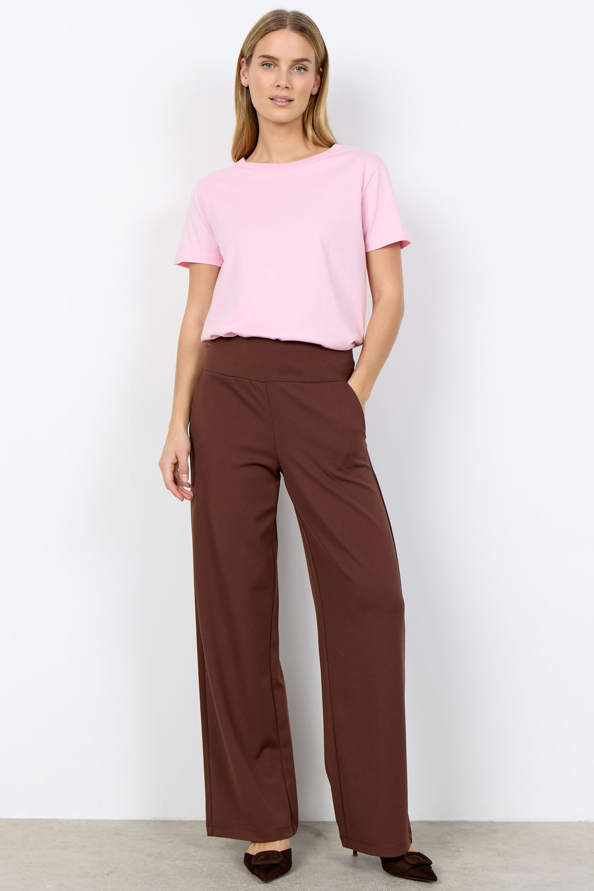 Så har du lige ramt en klassiker og basis fra SoyaConcept, nemlig sc-Derby 1 t-shirten som er fast i sortimentet. Den har rund udskæring i halsen samt er med korte ærmer. Den har normal løs pasform - regular fit. Kommer løbende i flere nye farver alt efter sæson.