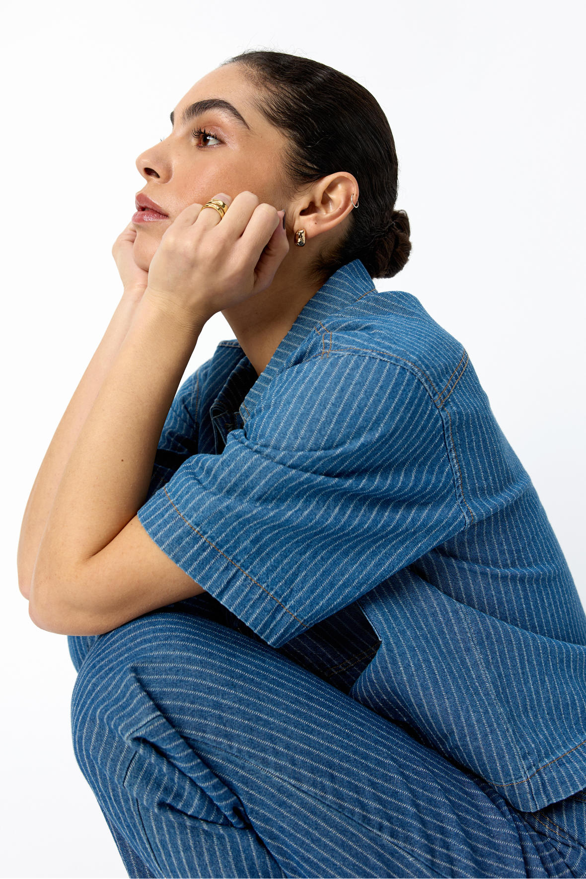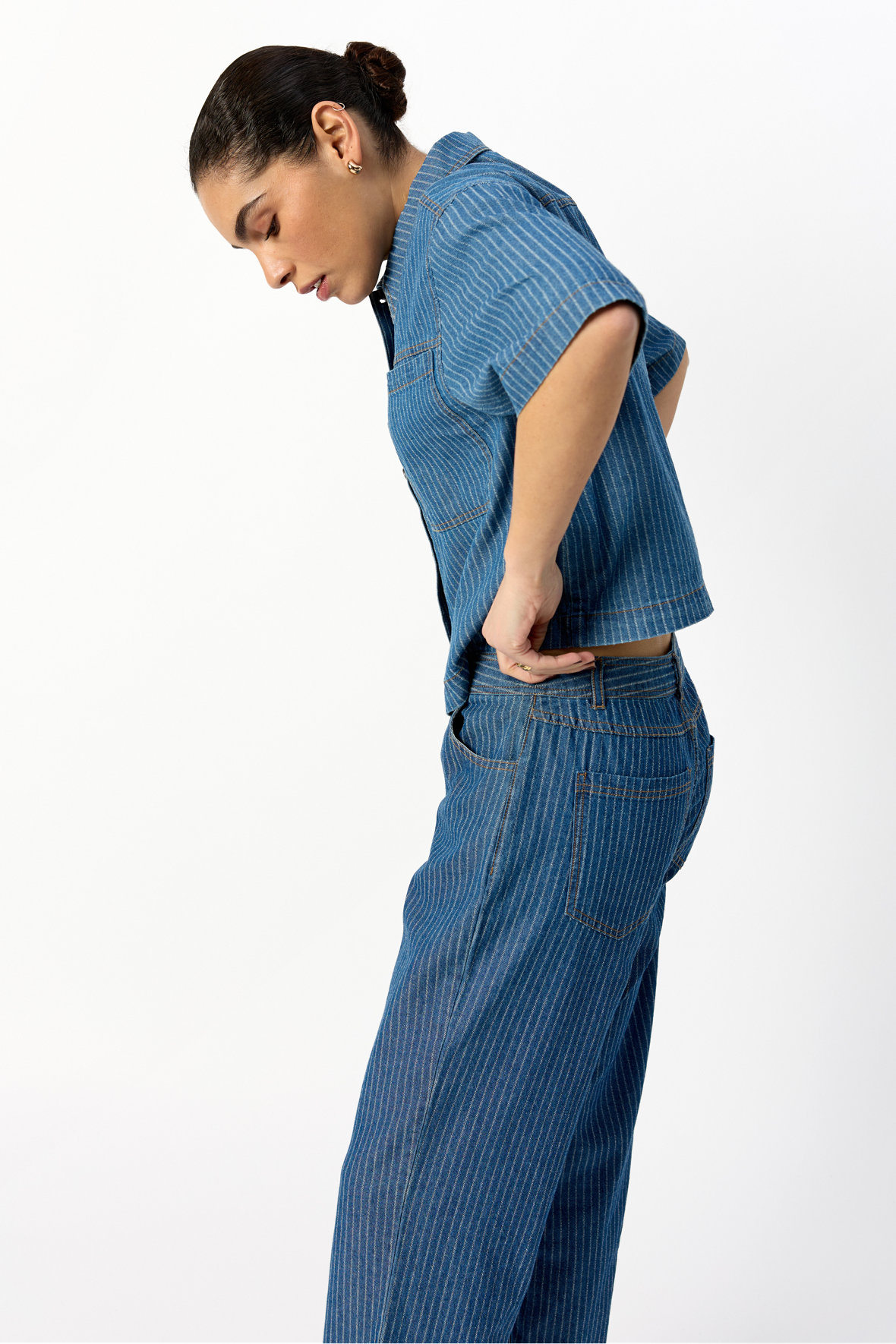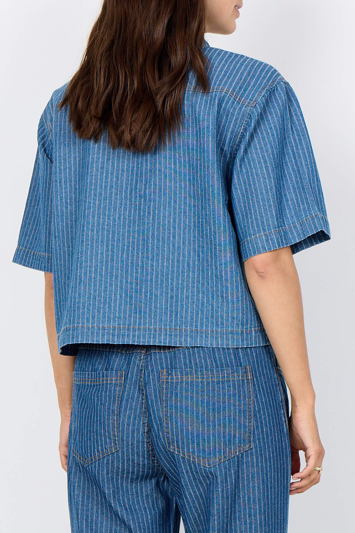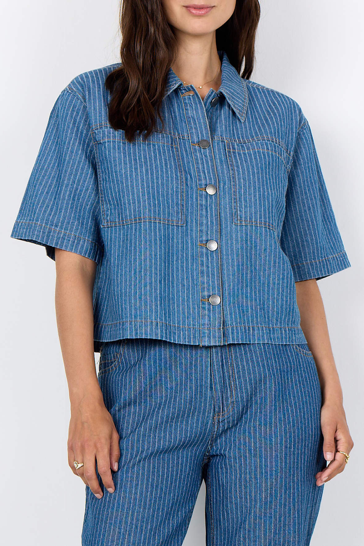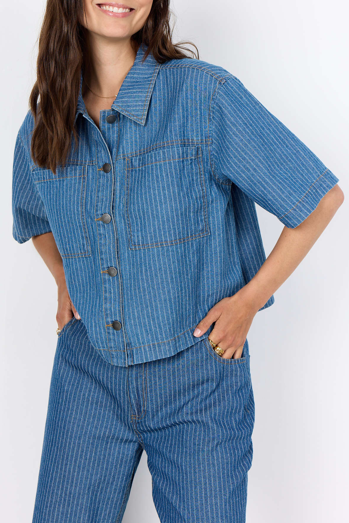 Så sker der altså noget, sjældent ser men denim skabe blikfang, men det er lige netop hvad jakken her gør. Den er lavet som en kort model med god vidde i kroppen samt ærmer, den er lidt oversized i pasformen. Sc-Caisho 1 sælger hurtigt, her må du ikke vente hvis den falder i din smag. Smuk blå denim farve med hvide nålestriber og kontrastfyldte stikninger i orange sætter rammen. Den har krave og lige under knapstolpe med jeans knapper, med store brystlommer der er helt rigtige i snit og placering. er du lidt modig tager du bukserne med som passer til, det er sådan et flot sæt. Fastvævet bomuldskvalitet.