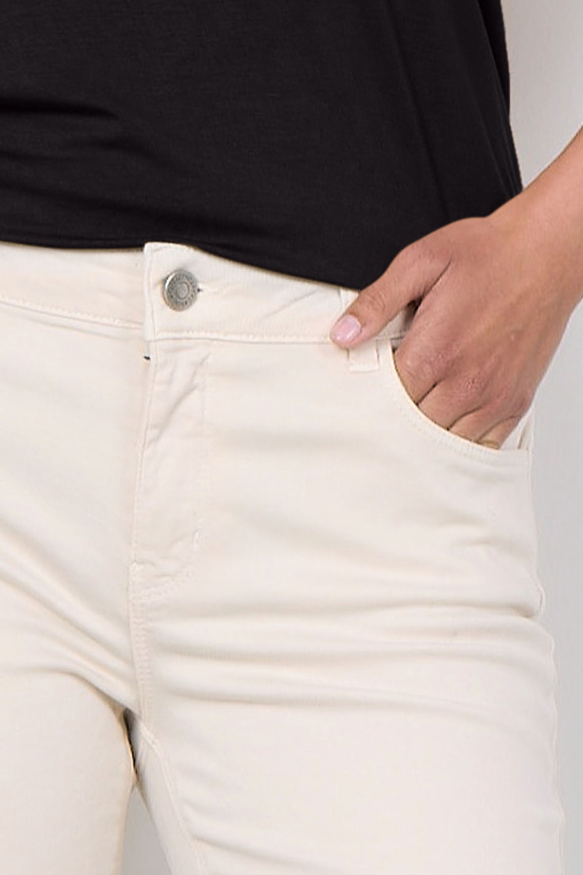 SC-Erna Patrizia 1-B er et par slim fit jeans i en lækker bomuldskvalitet. Bukserne har de klassiske 5-lommer og er uden nitter. I linning har den elastisk linning (også kaldet fast) og har bæltestropper samt knaplukke, gylp og lynlås. Let kvalitet til sæsonen og med stræk, alle stikninger er lavet tone i tone.