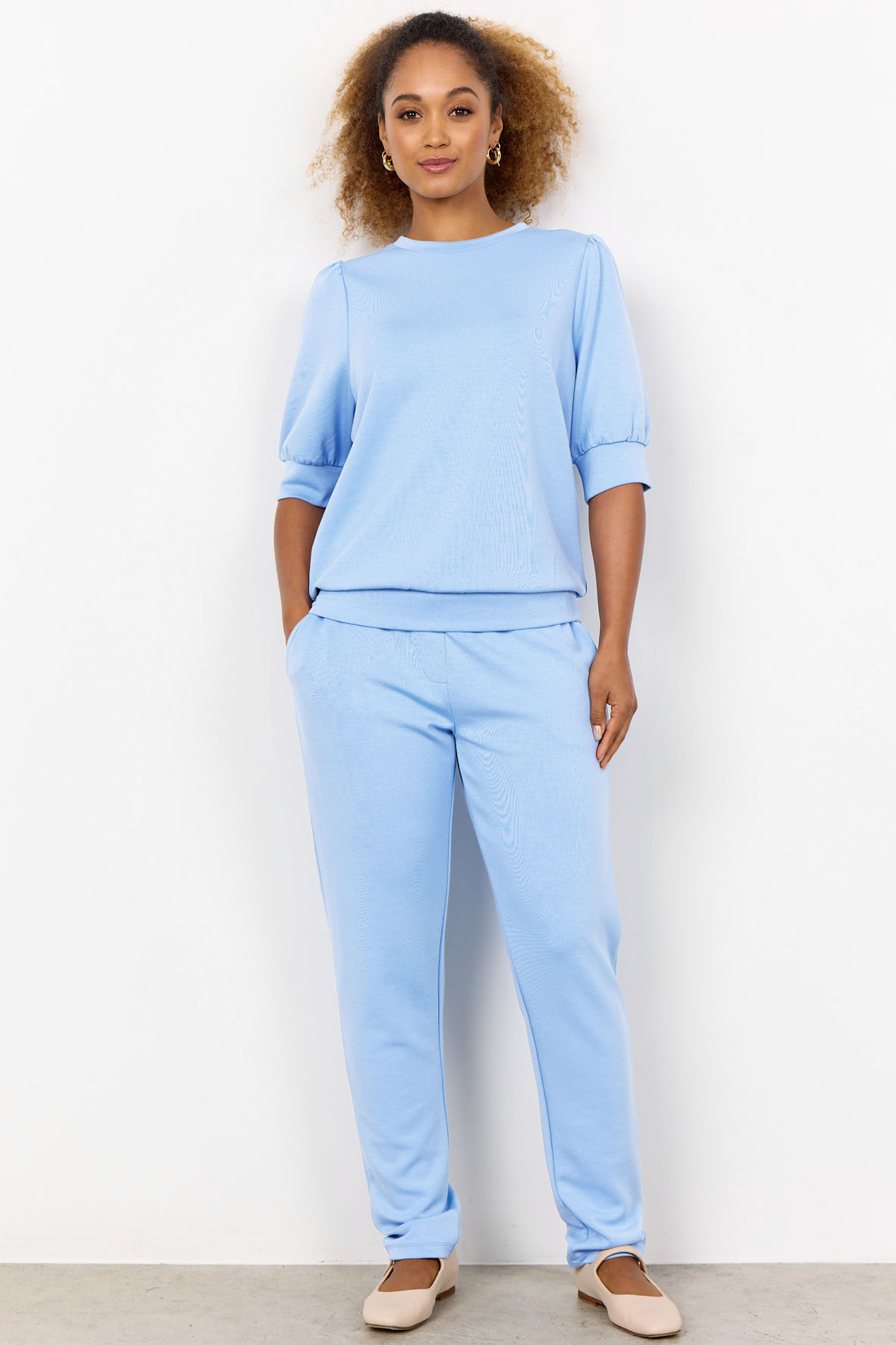 Så bliver det komfortabelt med den her sweatkvalitet der går under navnet sc-Banu 83, den kommer igen og igen i forskellige styles eller som præcist denne bare i andre farver. Rund i halsen med flot kant, den går faktisk igen på de korte ærmer samt ved linning. Der er lille puf på skulder. Den føles løs og så afslappet på, men går ikke på kompromis med det elegante udseende. Skal den blive din? Kvaliteten holder sig flot og krøller ikke.