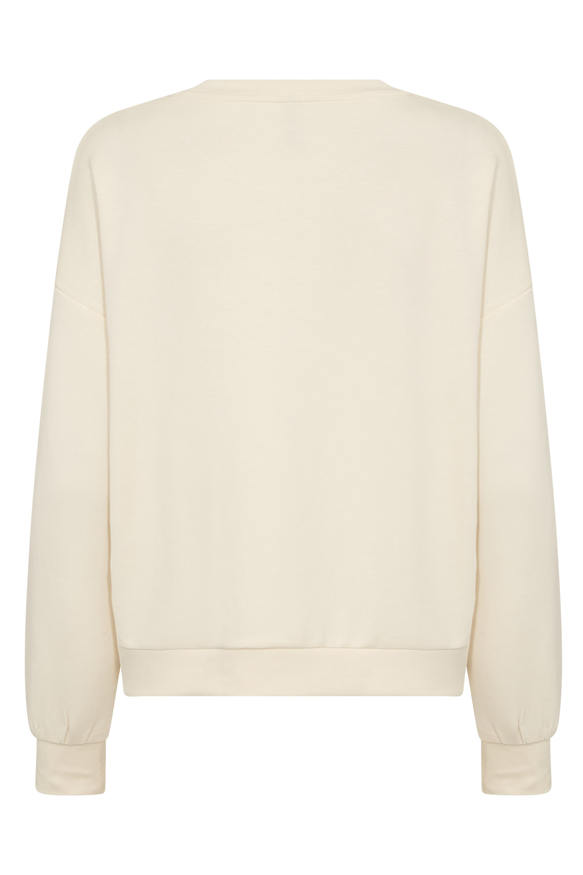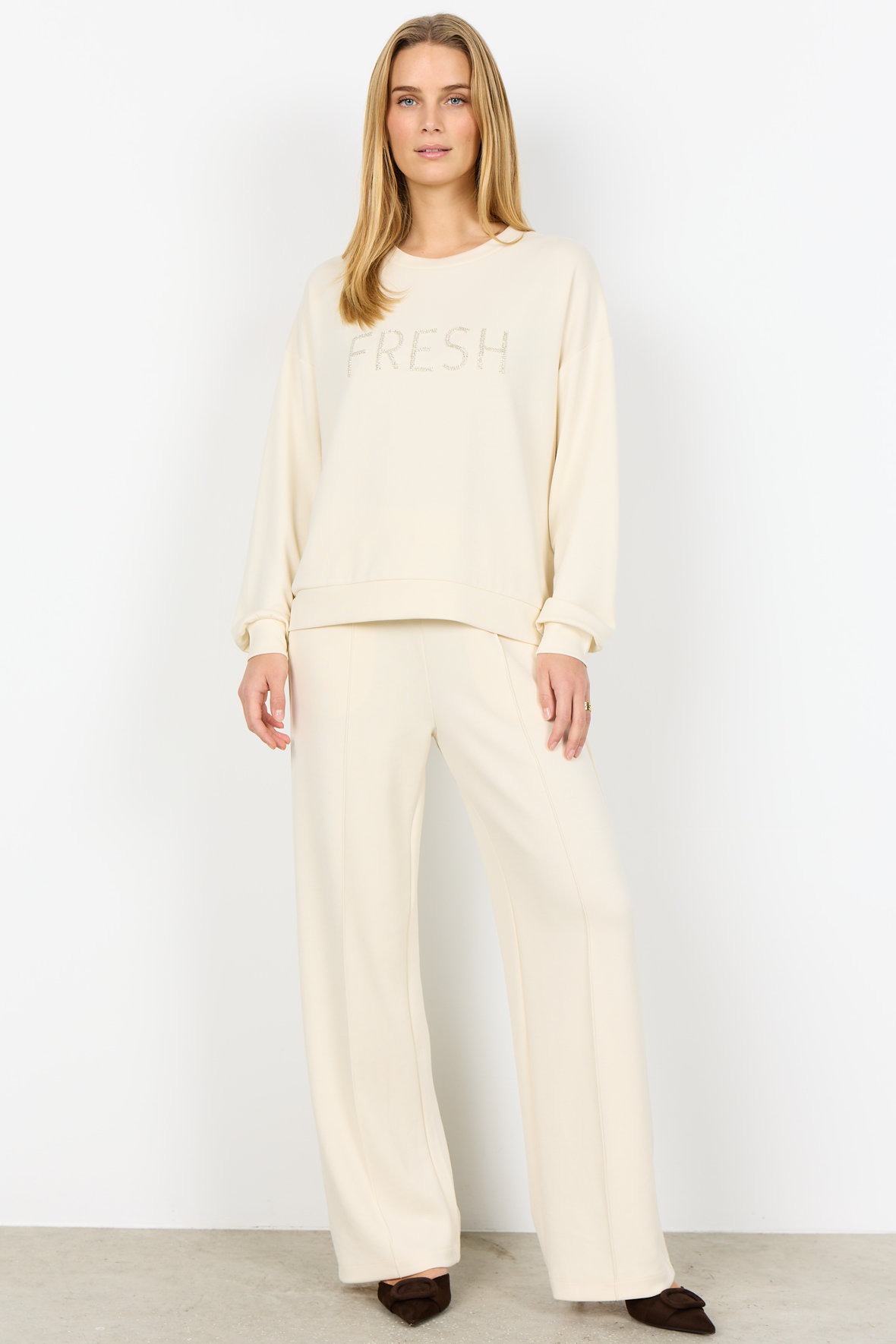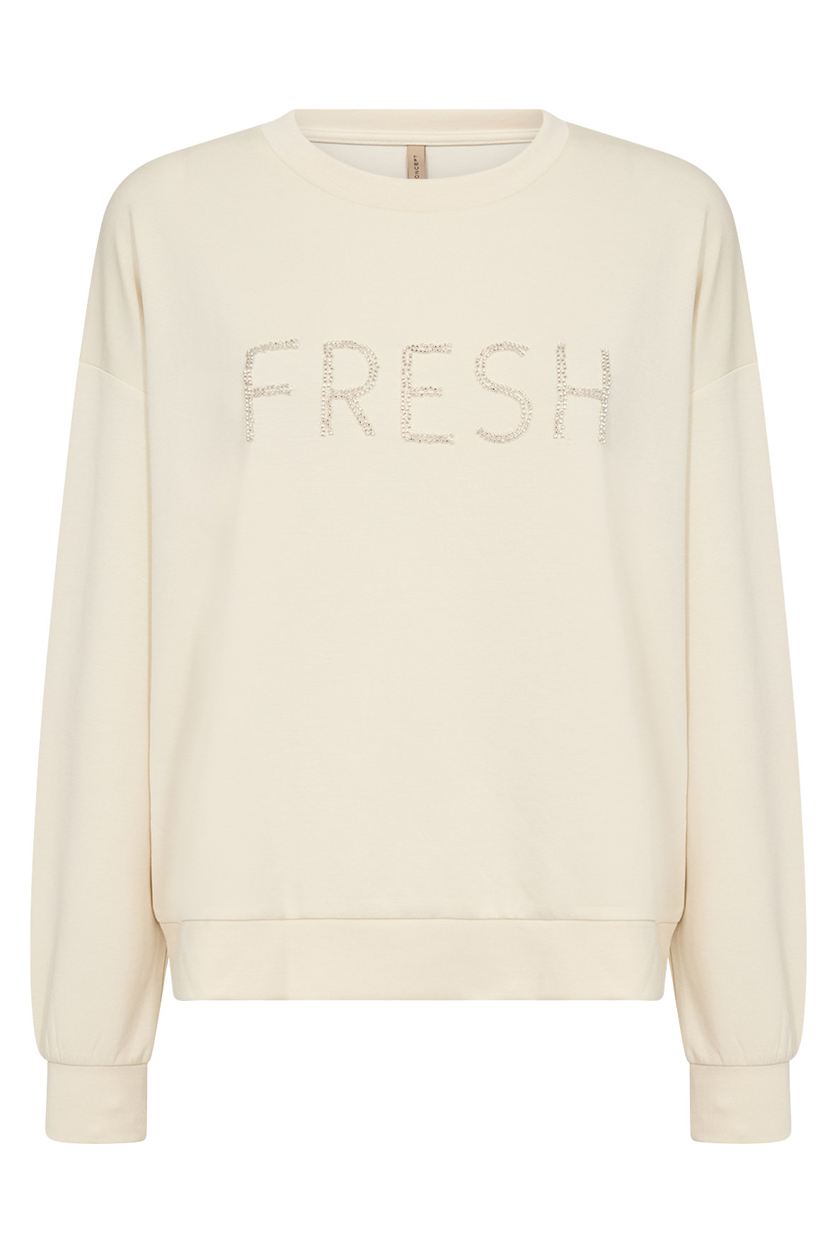 SC-BANU 291 - du ved den ekstra bløde sweat kvalitet der er fremstillet af modal, polyester og elastan. Den er en vildt dejlig oplevelse og er faktisk en kvalitet som Soya bruger igen og igen. Den har rund halsudskæring, lange ærmer med manchetter der matcher afslutning ved hofter. Teksten "Fresh" er små sølvperler der er syet på og derfor bliver de hvor de skal være. Skuldersømmen er trukket ned på overarmen.