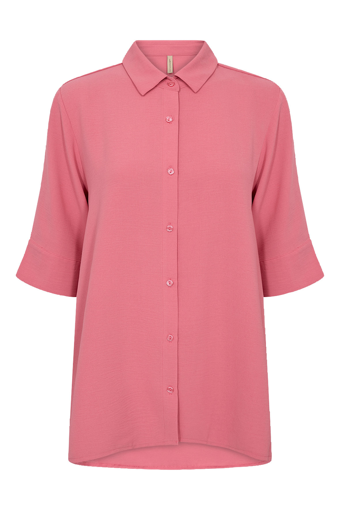 Sc-Cath 2 er en oversize skjorte fremstillet af 100% polyester der har crepe tekstur. Den har en elegant knaplukning foran med tone i tone knapper, en klassisk krave og halvlange ærmer. De slutter med manchet med knap og slids. Den har lidt mere længde foran men også bagtil hvorfor den er god uden på tøjet. Over ryggen har den 15-17 cm mere længde. Skillesøm på skuldre. Flot i udtryk og enkel.