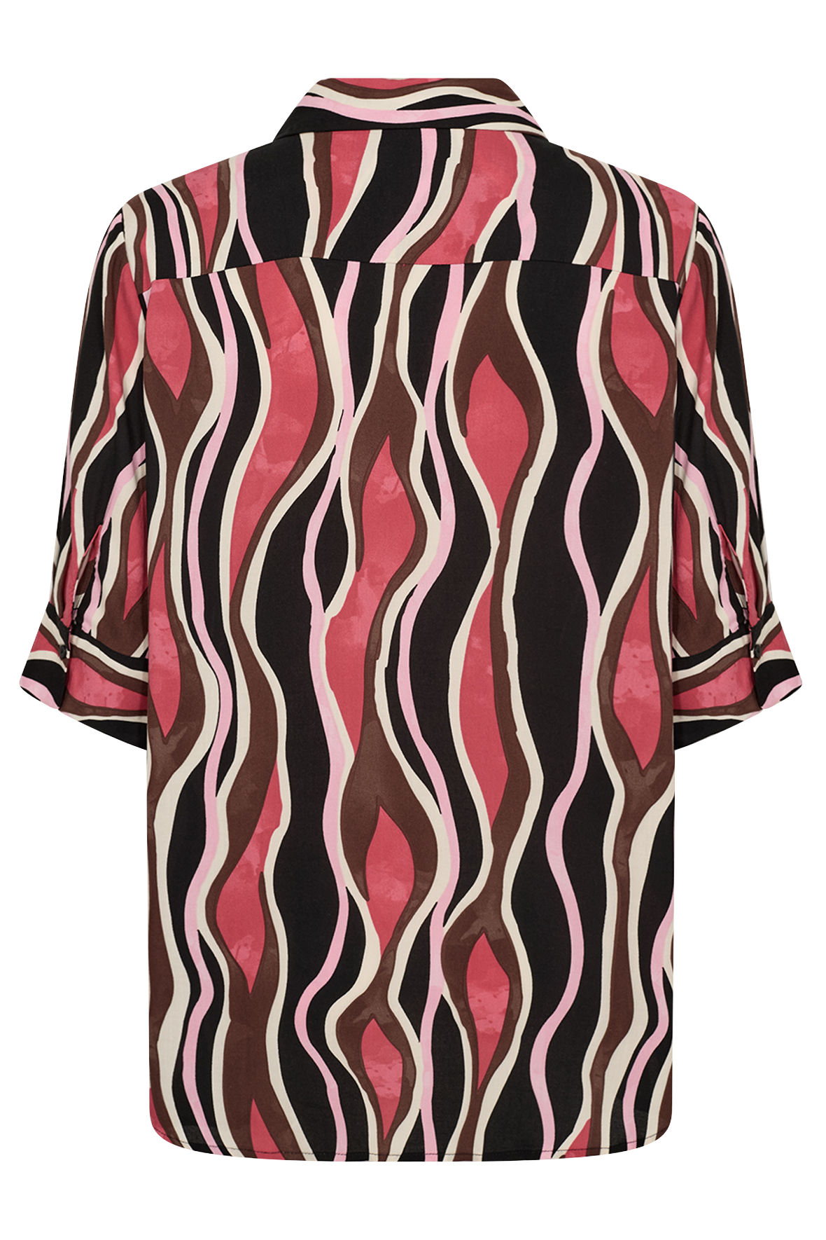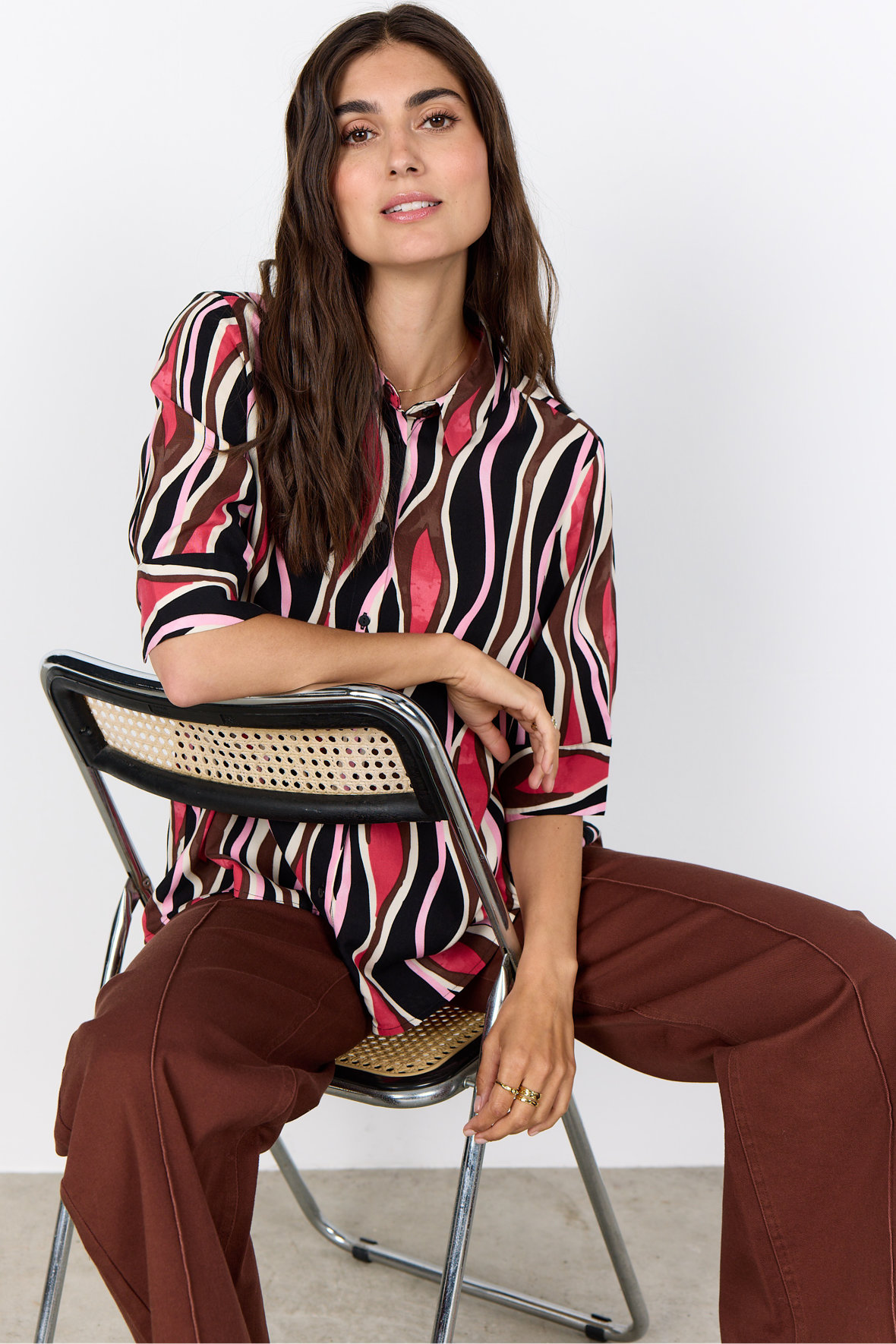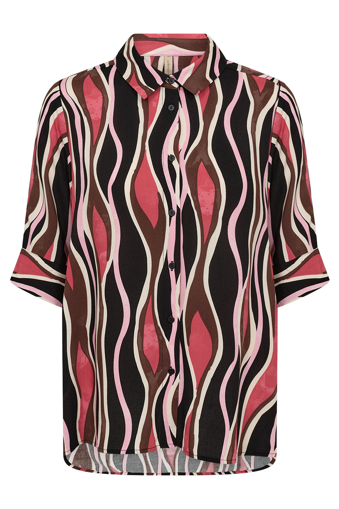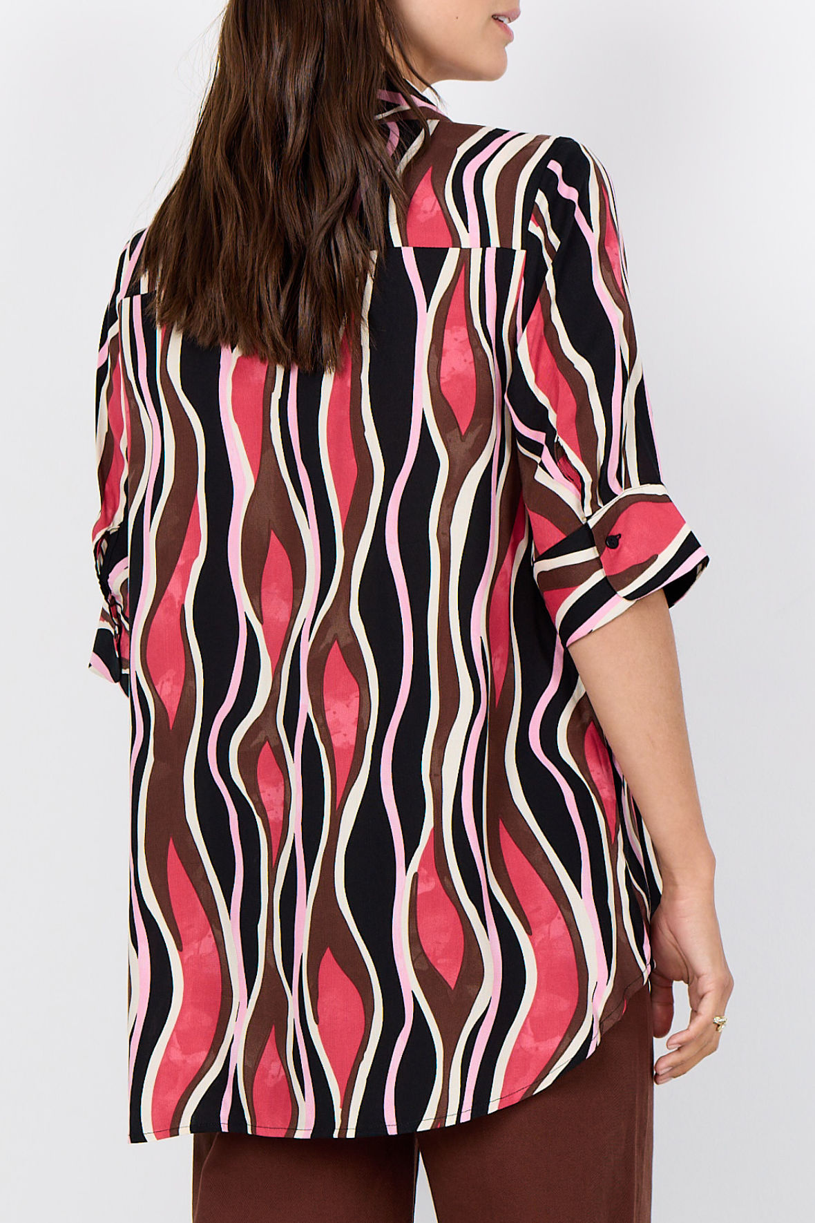 Sc-Cammi 2 er en stilfuld skjorte fremstillet af 100 % LENZING™ ECOVERO™-viskose dejlig let og åndbar. Skjorten har en klassisk krave, knaplukning foran med synlige sorte knapper og et iøjnefaldende bølgeprint med en lidt længere ryg der giver lidt ekstra til udtrykket idet det runder, hvor den fortil har ret skåret kant. Der er skillesøm på ryggen. Så bliver du klar til sommeren.
