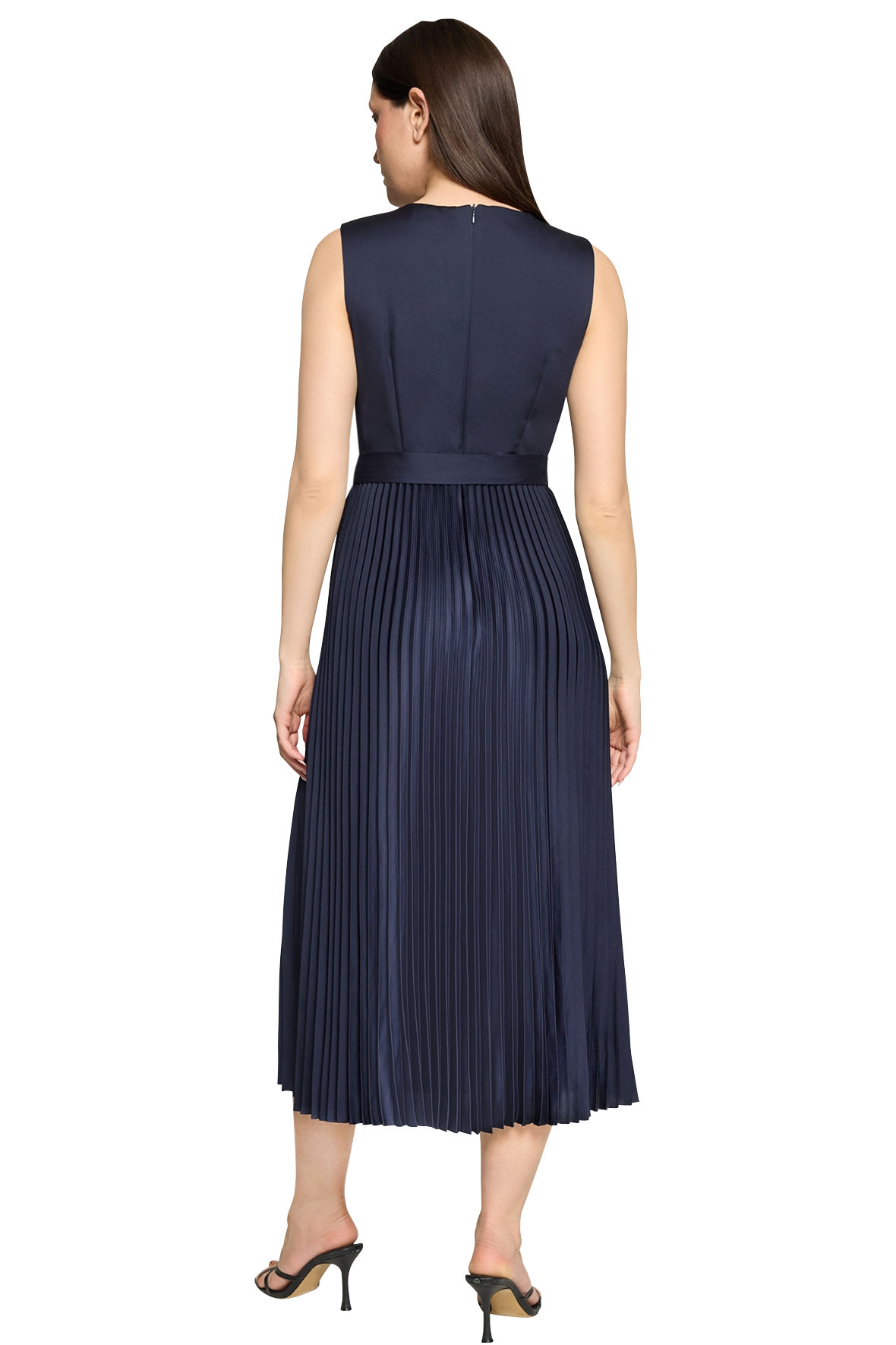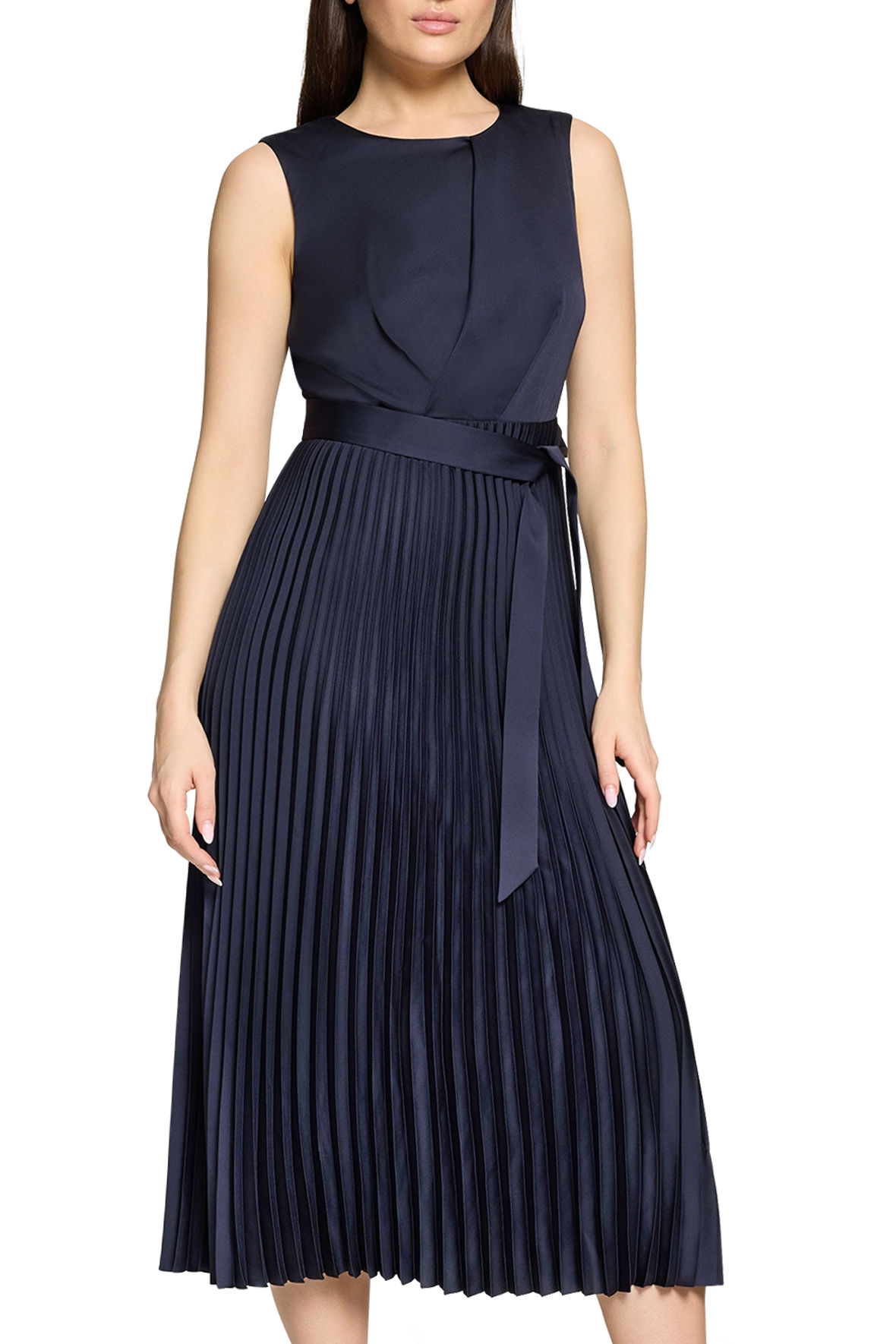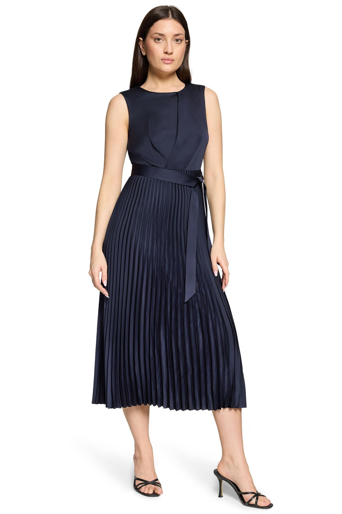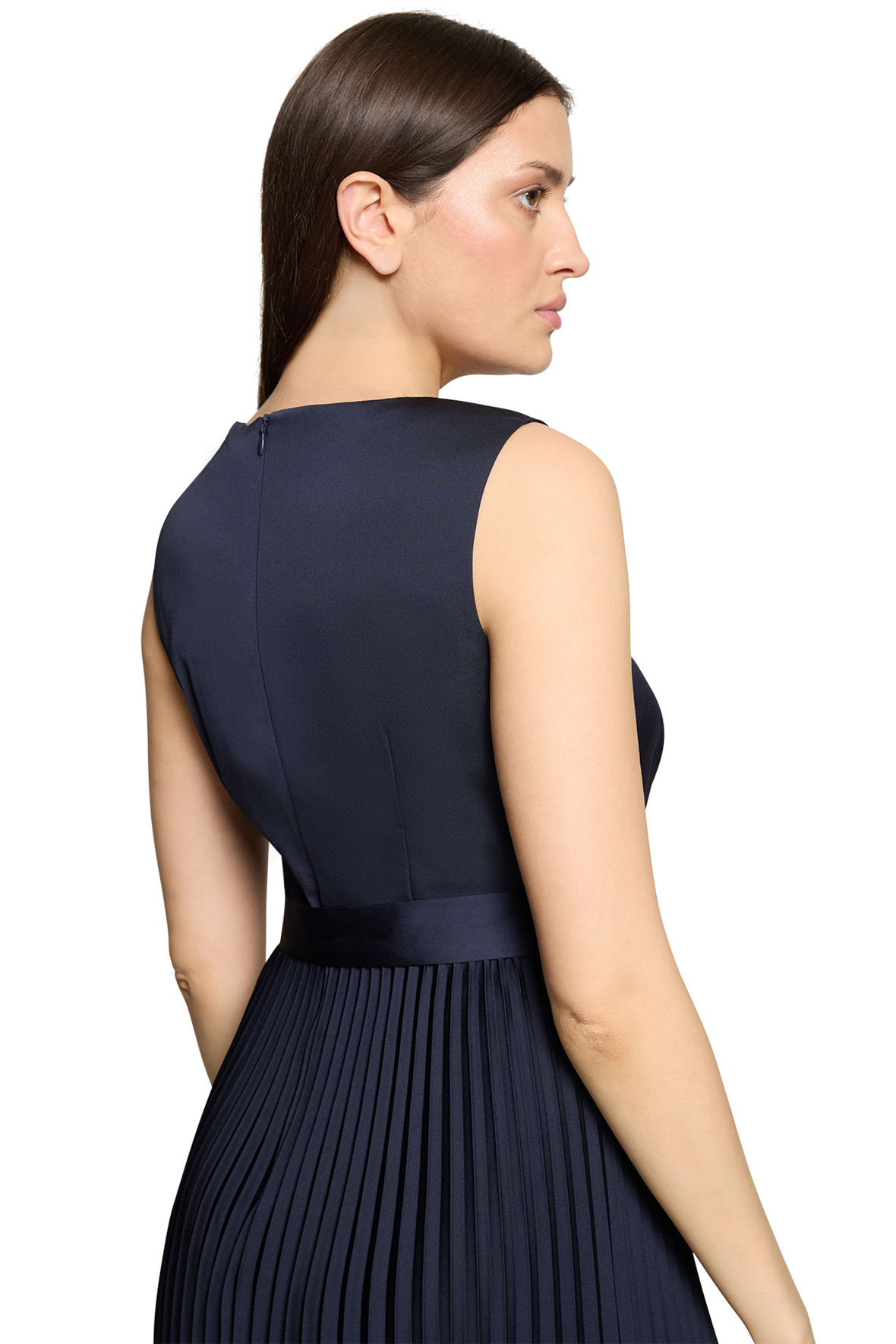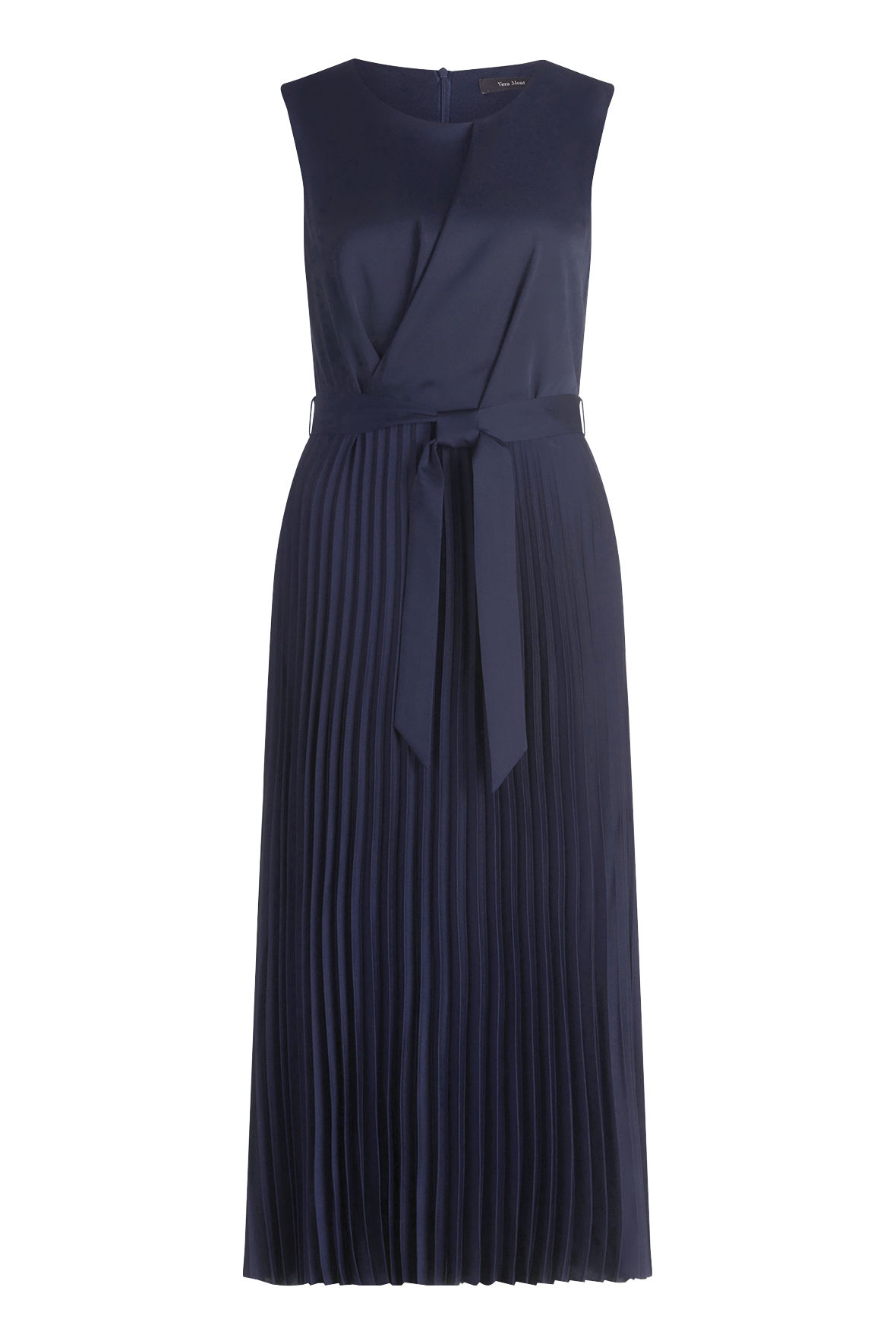 Åhhhh er den ikke vidunderlig, sikken farve der danser alt efter hvordan lyset falder fordi chiffon kvaliteten er blank. En fuldfed polyester der falder helt eminent. Her er du landet på en ærmeløs midi kjole der har noget særligt over sig med plisse med vidde nederst, sikke et sammenspil med bryststykket. Flot med skrå assymetriske læg. Bemærk overgangen mellem de to har fået et løst bånd der kan markere taljen. Jeg elsker når taljen markeres (og det klæder virkelig også selvom du ikke mener din talje er noget særligt) det er vigtigt for forståelsen af kroppens proportioner. Den er så kompleks men enkel i udtryk, ung og livlig, lige klar til et dansegulv. Vera Mont leverer bare en eksklusiv vare der er velafprøvet på os nordiske piger.