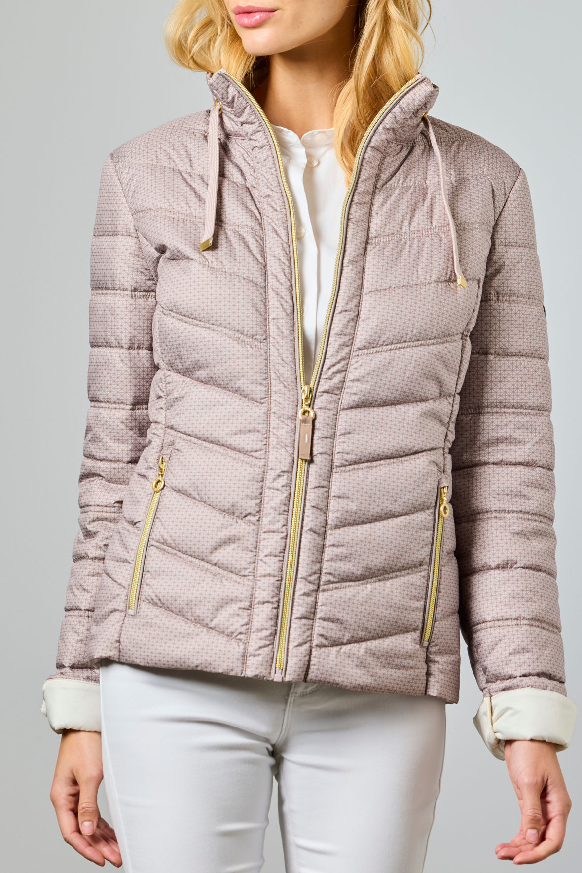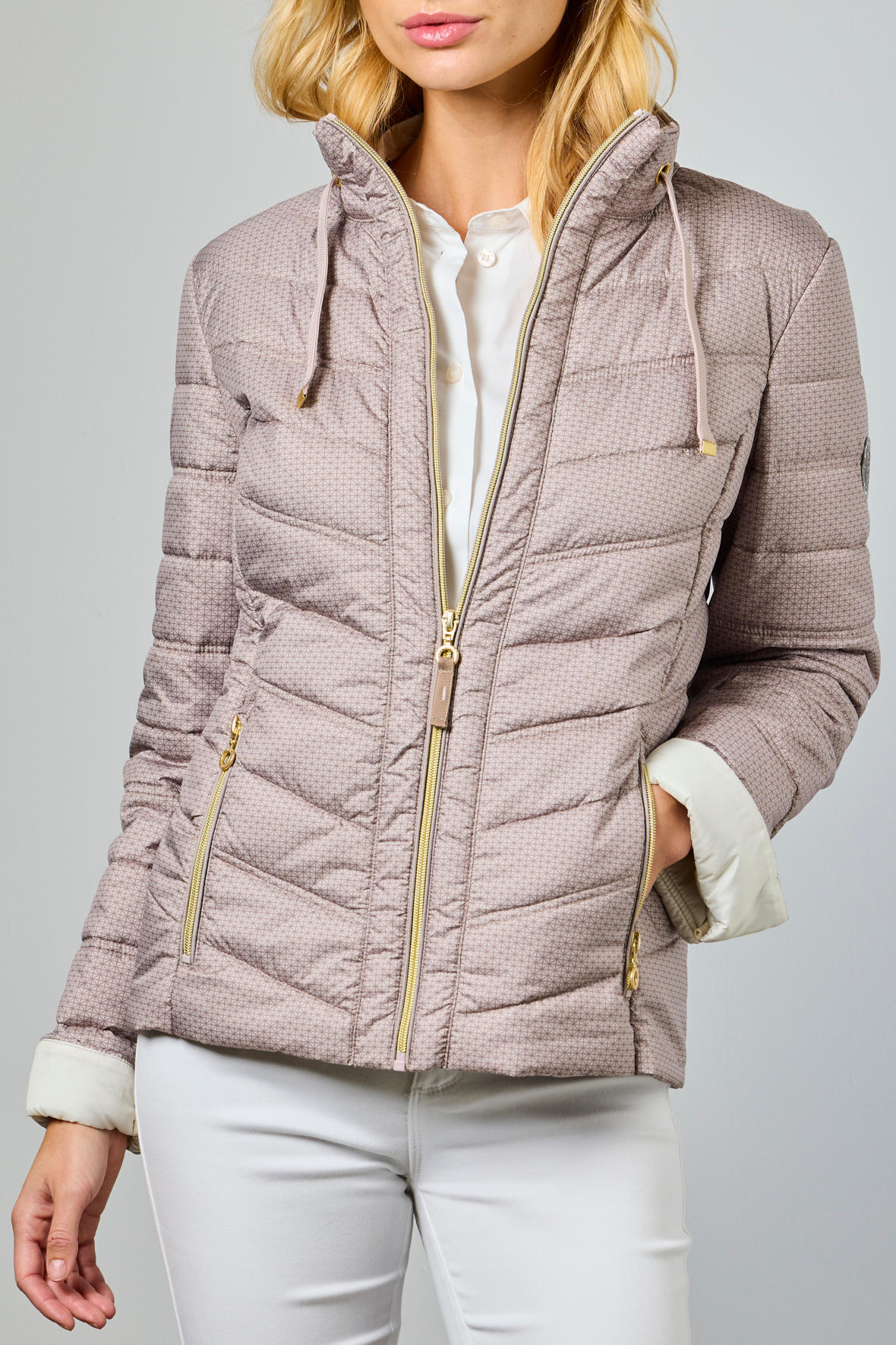 Elizabeth-jakken er en klassisk quilt med med smarte og gennemtænkte detaljer og byder desuden på et elegant print, og det gør den virkelig elegant. Fremstillet af 100 % genanvendte materialer, herunder yderstof, foer og fyld – et bevidst valg uden at gå på kompromis med stil eller komfort. Den er til sæsonen fra forår frem til og med efterår og har altså varmende foer. Jakken er designet med en skjult hætte i kraven, hvilket gør den ideel til omskifteligt vejr. Og, selvom den er skjult er den justerbar via snører i kraven. Fuld af smukke detaljer så der er noget for øjet, der er virkelig kælet for den. Ærmerne kan bukkes op og afslører en kontrastfarvet slidsmanchet, der tilføjer et dynamisk friskt element til looket. Farven 13–beige byder på tone-i-tone foring med guld tilbehør for et mere elegant udtryk. To udevendige lommer med guldlynlås skal du heller ikke undvære. Pasformen er Modern Fit som lige viser lidt figur uden at sidde tæt. Quiltninger er lavet så du får en flot figur. Den stopper vinden men er ikke så god til længerevarende regn. En glimrende kørejakke fordi den er kort.