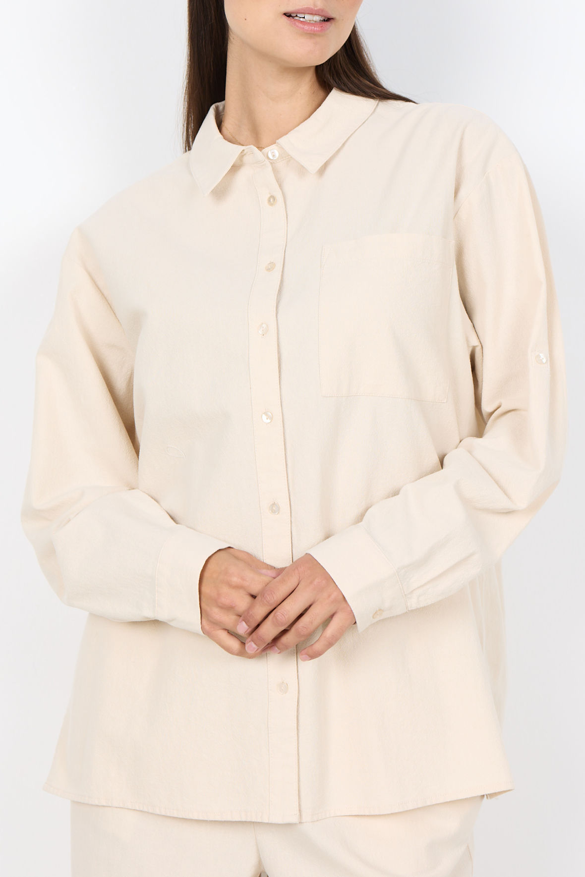 Så er du lige faldet over en bomulds skjorte med et lidt mere løst snit. Sc-Cissie er præcis som bukserne af samme navn, en lækker sommerlig kvalitet. Lidt smallere cut away krave der er lidt mere feminin, herunder med knapstolpe der går igennem. Med påsat brystlomme, og nu vi er her er der ikke indsnit ved barm den er bare helt løs og har også god vidde. Ærmer har fuld længde, de slutter med knapmanchet samt har også tuck up strop, så du kan rulle ærmer op og sætte dem fast med knapstrop, en smart sommerdetalje. Ryggen har skillesøm med læg under.