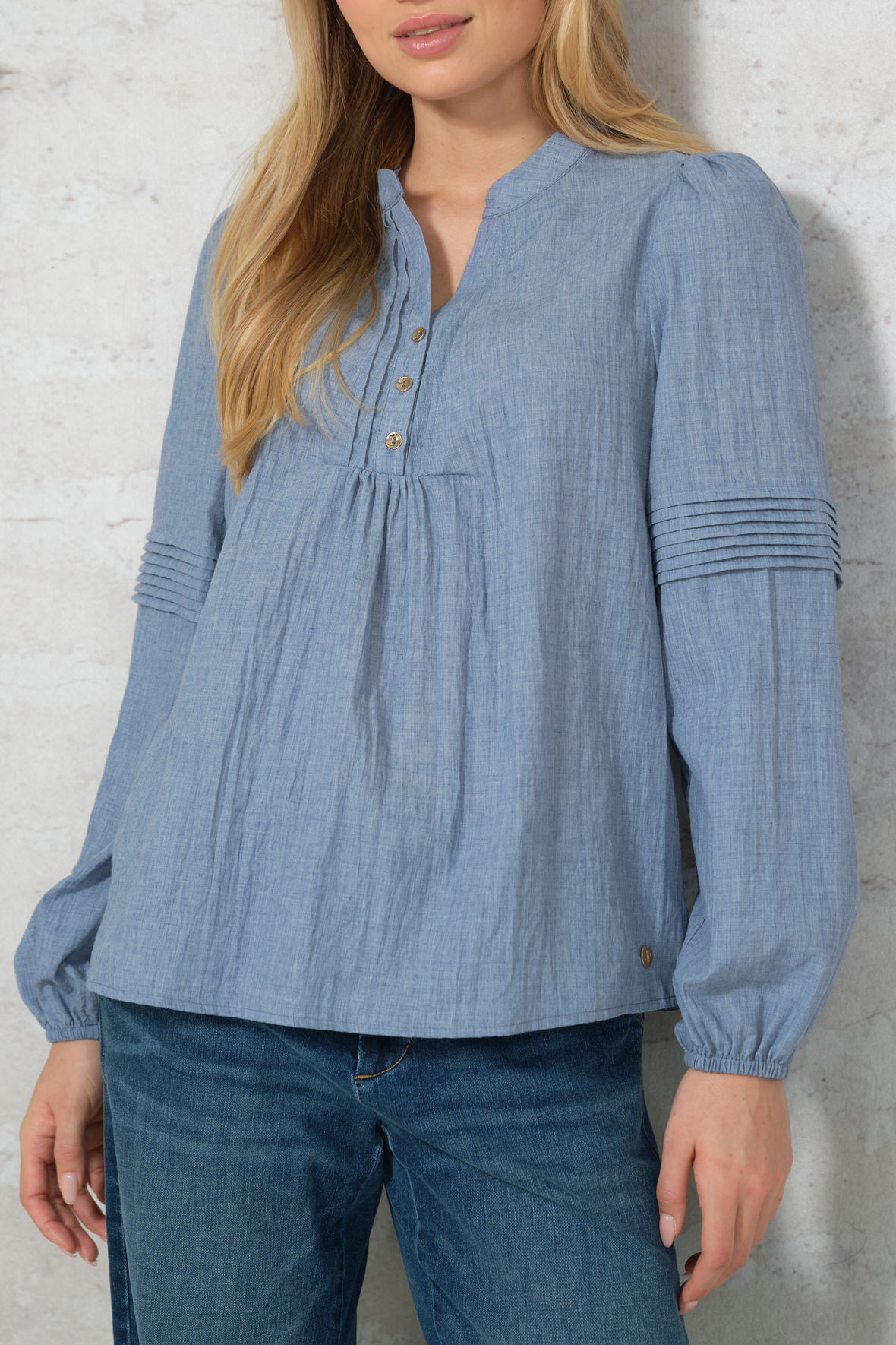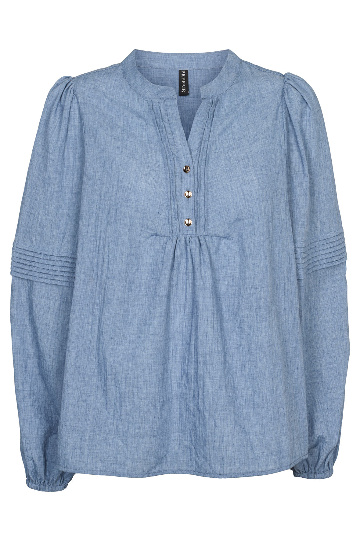 Luna bluse er en feminin og tidløs bluse i en smuk, støvet blå nuance der leder tankerne hen på denim, lavet med en let struktureret kvalitet, der giver et blødt og naturligt fald. Blusen har en lille ståkrave med V-udskæring og en kort knaplukning foran med fine, gyldne knapper. Diskrete læg ved brystet og fine lægdetaljer på ærmerne skaber let volumen og et sofistikeret look. De lange ærmer afsluttes med elastik ved håndleddene for ekstra komfort. Faste plisse folder på ærmer. Den er smuk og meget for øjet og snittet er løst. Ryggen har skillesøm samt læg. Prepair er oftest til den store side, så tænker du skal jeg bruge L eller Xl, vil jeg anbefale en Large.
