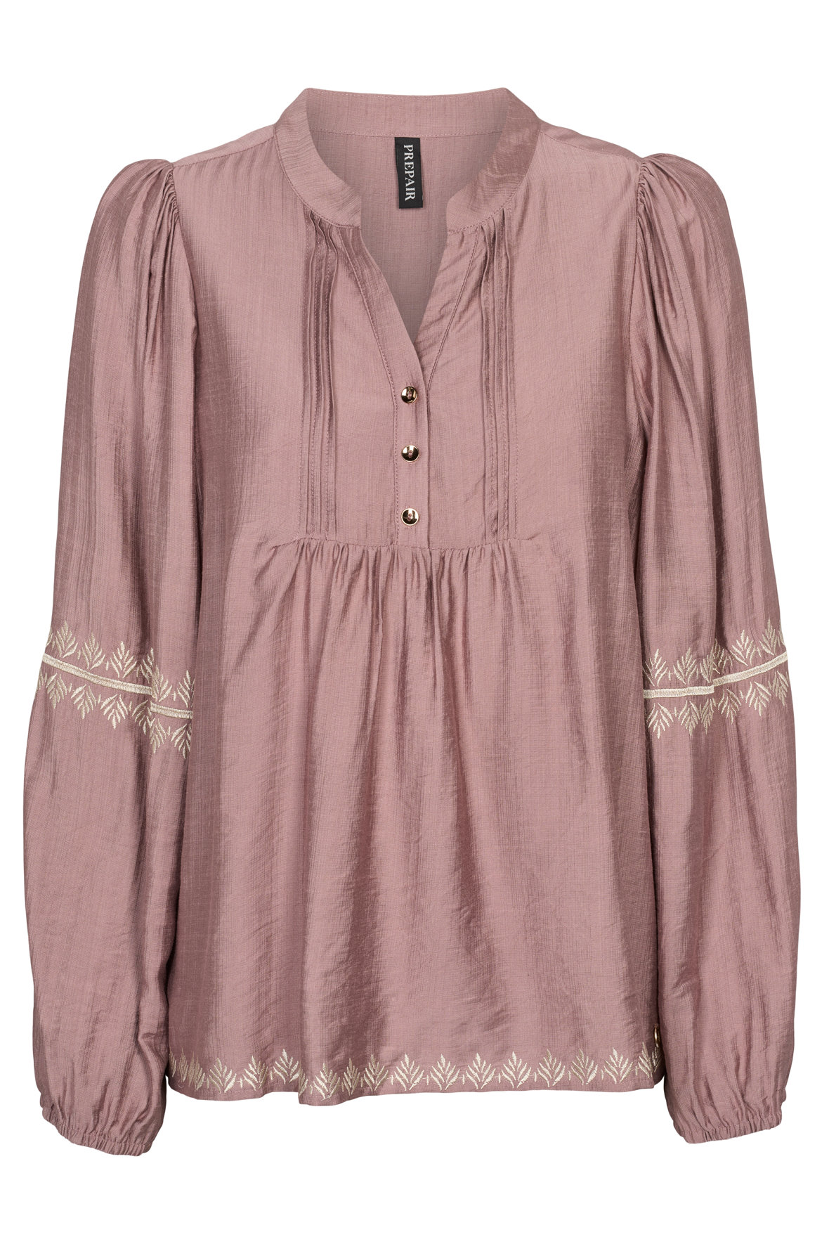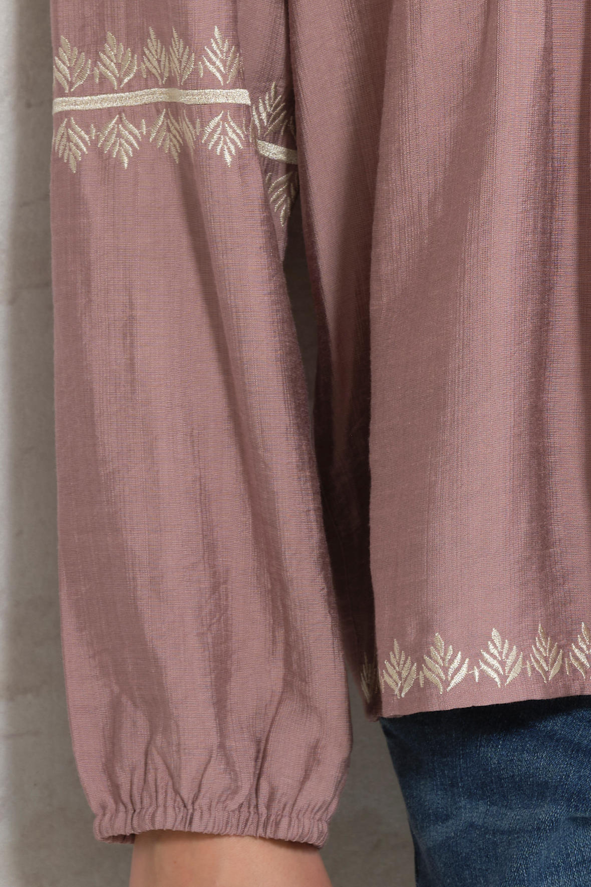 Camilla Blouse er en romantisk og feminin bluse i en smuk, støvet rosa nuance, den er tæt spækket med smukke detaljer der giver noget for øjet. Den lette og bløde kvalitet giver et elegant fald og en behagelig pasform. Blusen har en lille ståkrave med åben V-udskæring og en kort knaplukning foran med fine guldknapper. De lange ærmer er let puffede ved skuldrene og afsluttes med elastik ved håndleddene, hvilket skaber et blødt og feminint udtryk. Smukke broderede detaljer på ærmerne og langs kanten forneden tilfører en fin detalje. Med sød lille genistreg ved bryst og barm der får den til at falde løst. Den har et smukt skindende look. Lækker åndbar kvalitet. Normal løs pasform.