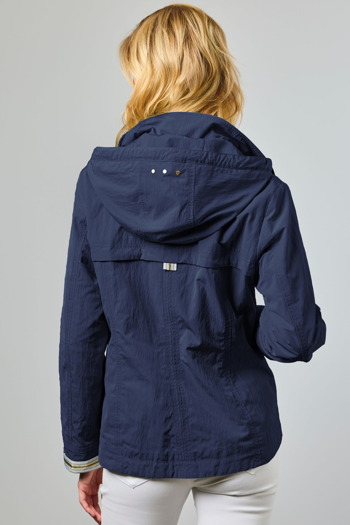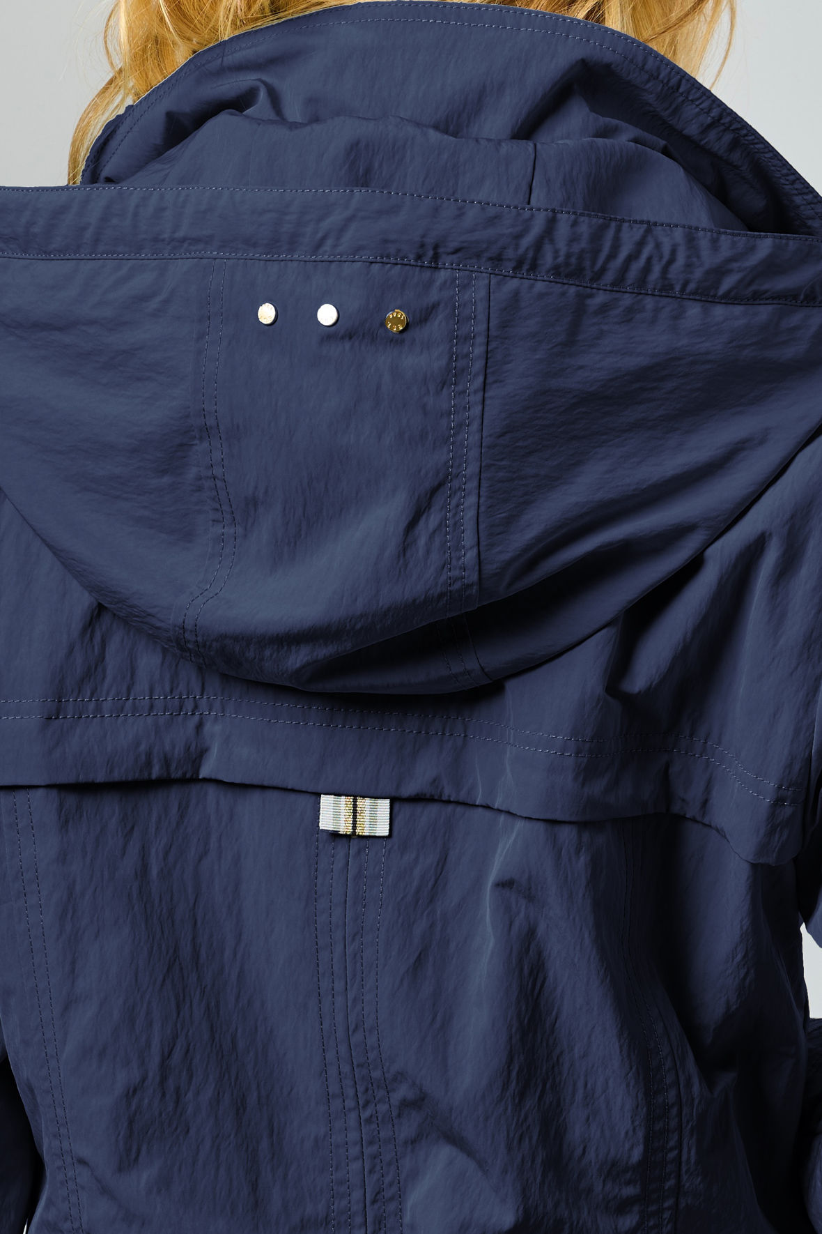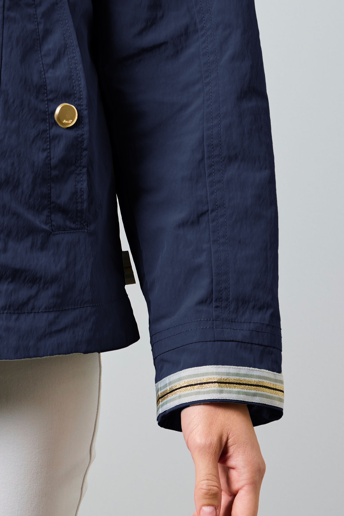 Norma-jakken kombinerer feminint design med praktiske detaljer til hverdagsbrug, den er lavet som en overgangs- og sommerjakke. Med en behagelig pasform og dekorative syninger tilbyder jakken både stil og funktionalitet. Der er et godt øje til detaljer som der er mange af, som farvet bånd og guld. Den har frontlukning med lynlås og overslag med trykknapper, diskrete paspellommer med trykknapper samt en aftagelig hætte med printet snor. De stribede bånd på manchetterne og langs lynlåsen i matchende skalfarver og med gulddetaljer giver et sofistikeret udtryk.