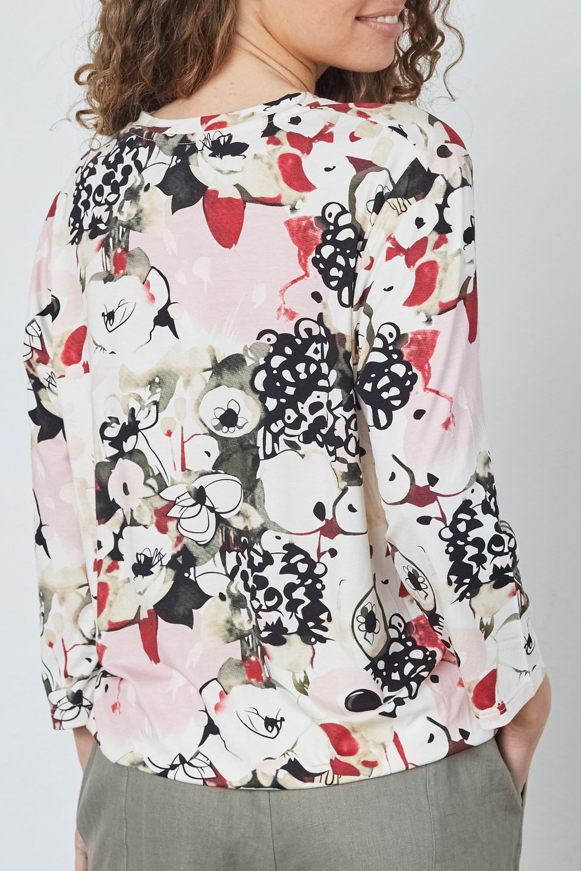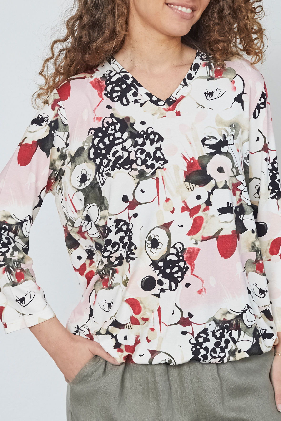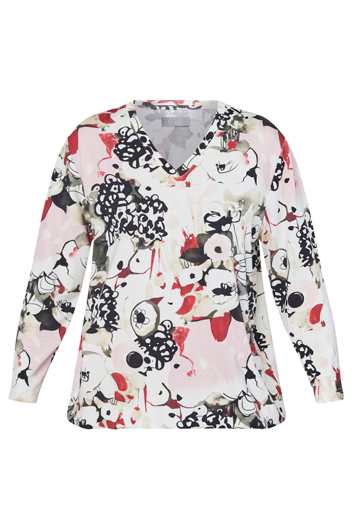 T-shirt fra Elton der har et elegant grafiskt udseende og udtryk med et detaljeret all-over print. Det grafiske mønster giver designet et eksklusivt præg, mens den bløde viskosekvalitet med let stræk sikrer høj komfort og en smuk pasform. En stilfuld og feminin style, der tilfører personlighed til hverdagsgarderoben. Den har åben V-udskæring samt ærmer i 3/4 længde. Den har løs pasform med plads ved barm og mave som bliver forstærket af at den har elastisk linning der får den at pose flot ved maven. Kvaliteten er en Jersey du ikke kommer til at mærke noget til.
