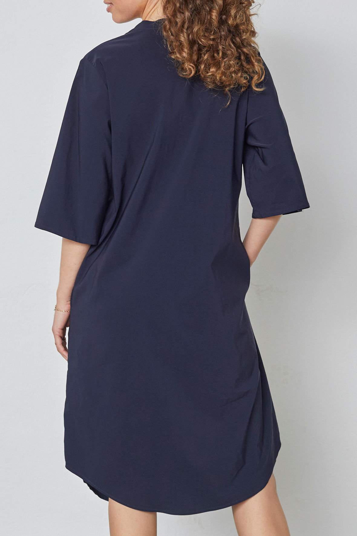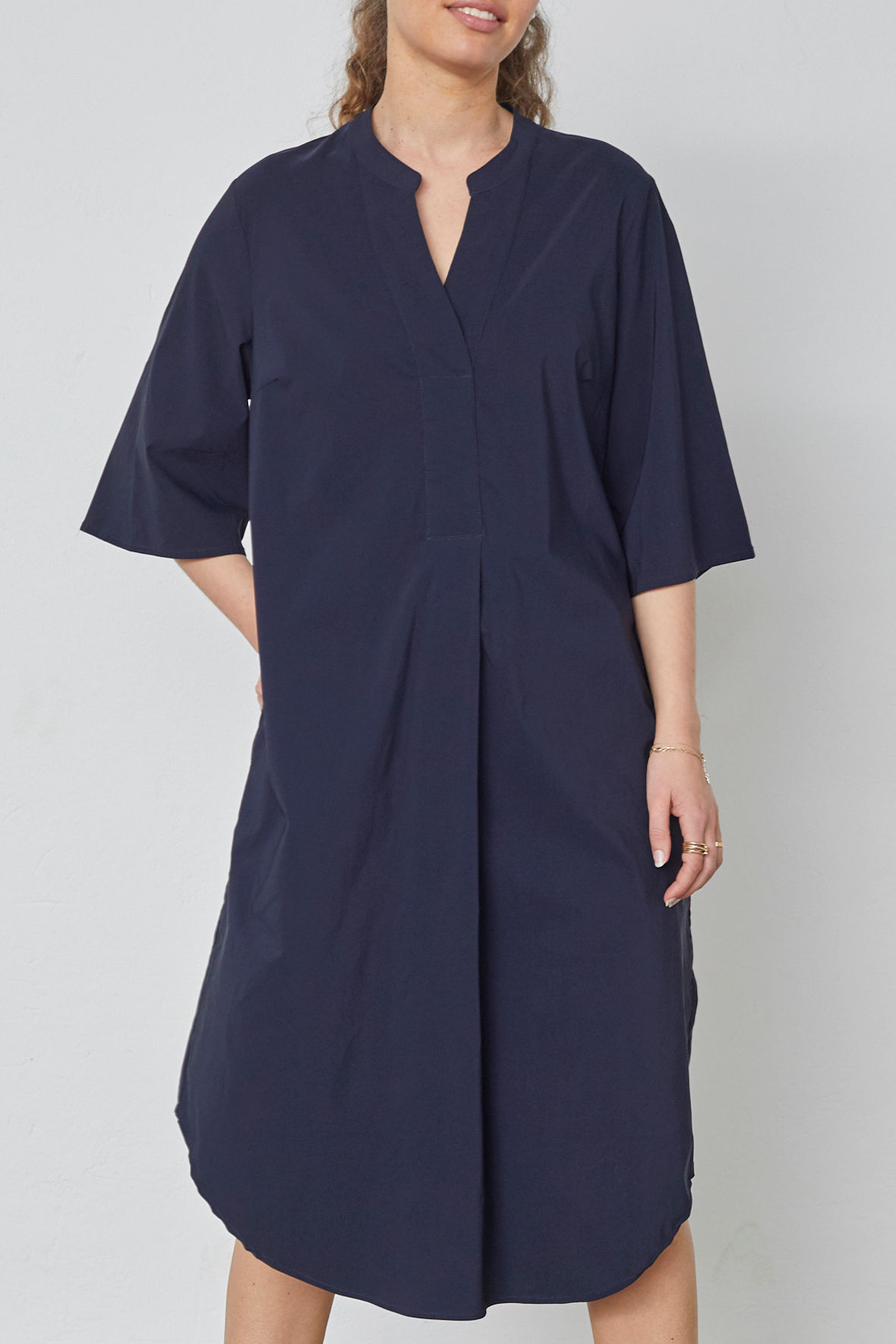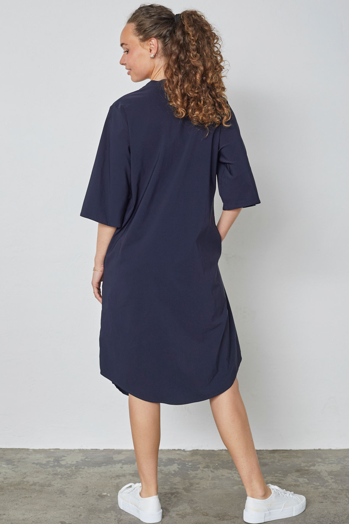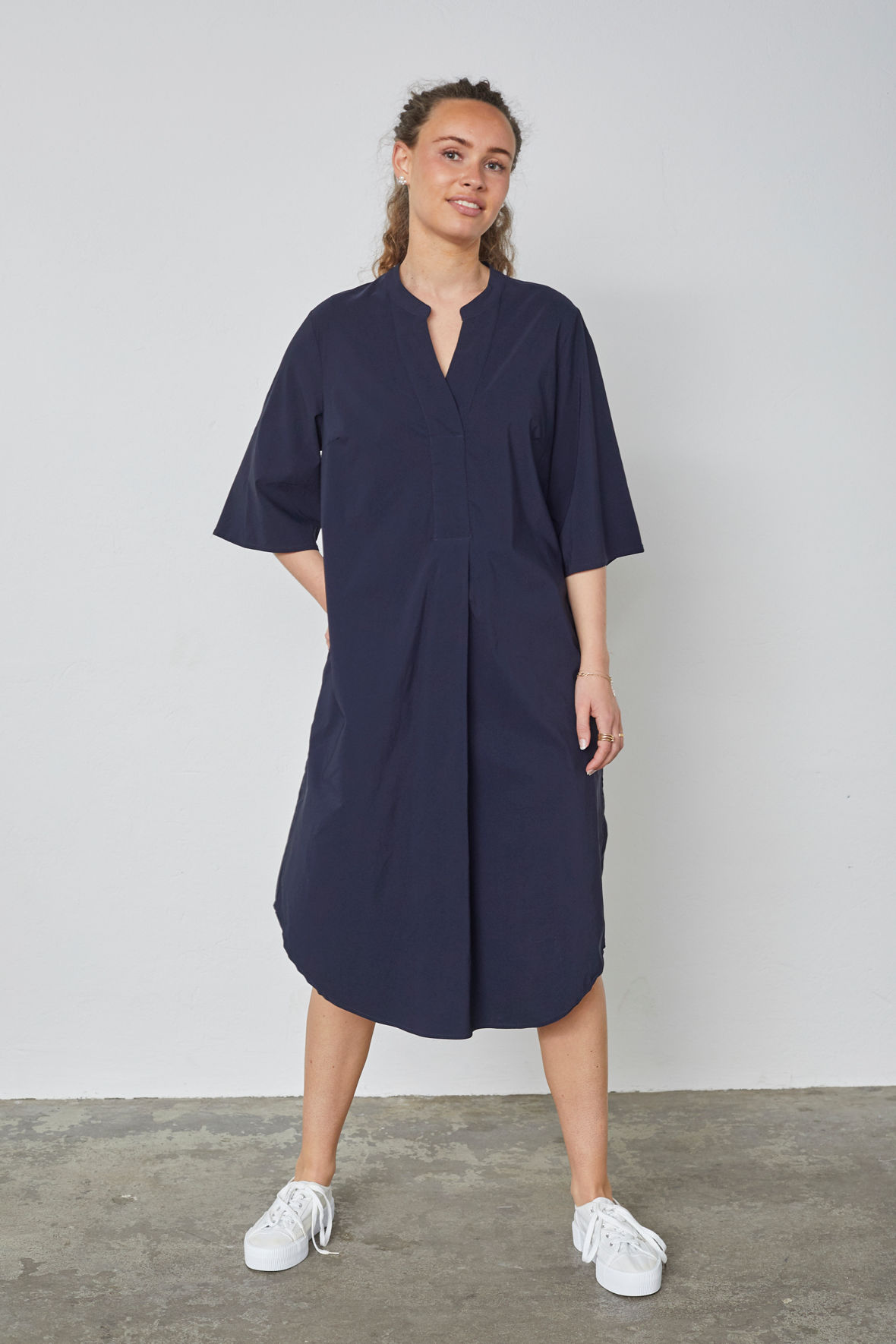 Elton kjolen ETKida har et afslappet og moderne udtryk med fokus på komfort og bevægelse. Den ekstra lette kvalitet med viskose og stretch giver en behagelig fornemmelse og et flot fald, mens den oversized silhuet skaber et ubesværet, stilrent look. En alsidig kjole, der fungerer lige godt til hverdagsbrug som til mere afslappede anledninger. Den har rund krave med åben V-stolpe der ender med læg i spidsen, det skaber lidt tryghed ved maven. Ærmer har halv længde. Den er helt glat på ryggen og i sidesømmen har den lommer der er så dejligt praktiske. Den runder forneden for og bag. Så du visuelt får lidt længere ben. Style den med sneakers for et casual udtryk, eller tilsæt sandaler og accessories for et mere gennemført og feminint look. Jeg tænker at den bliver en favorit i manges hjerter. Den har god plads til barmen hvor den også har indsnit så den har en flot silhuet selvom den har plads.