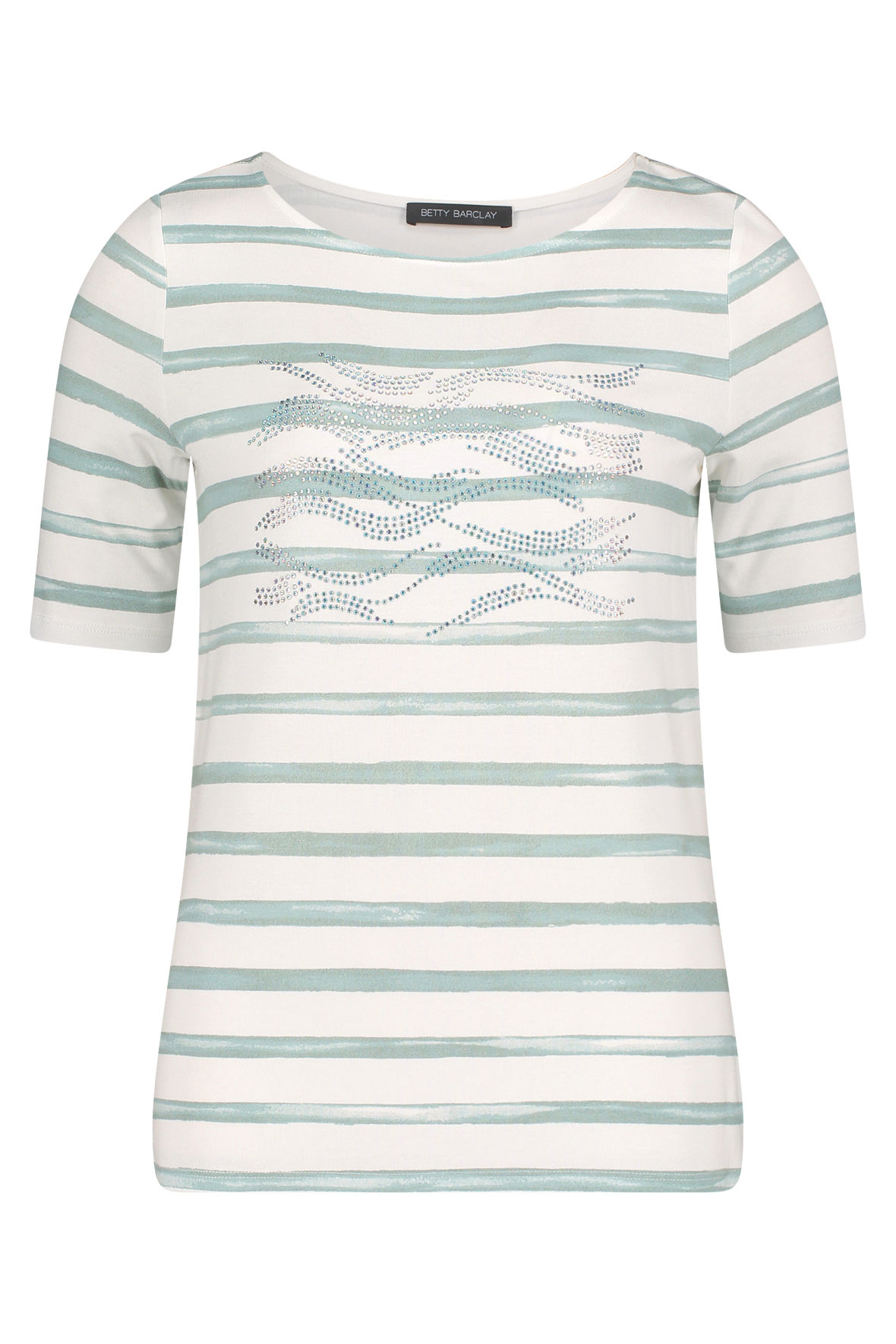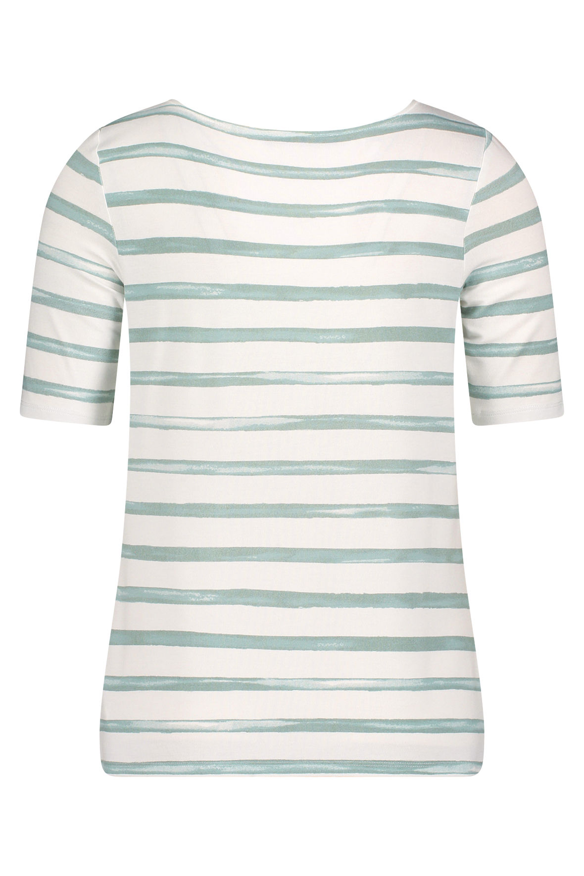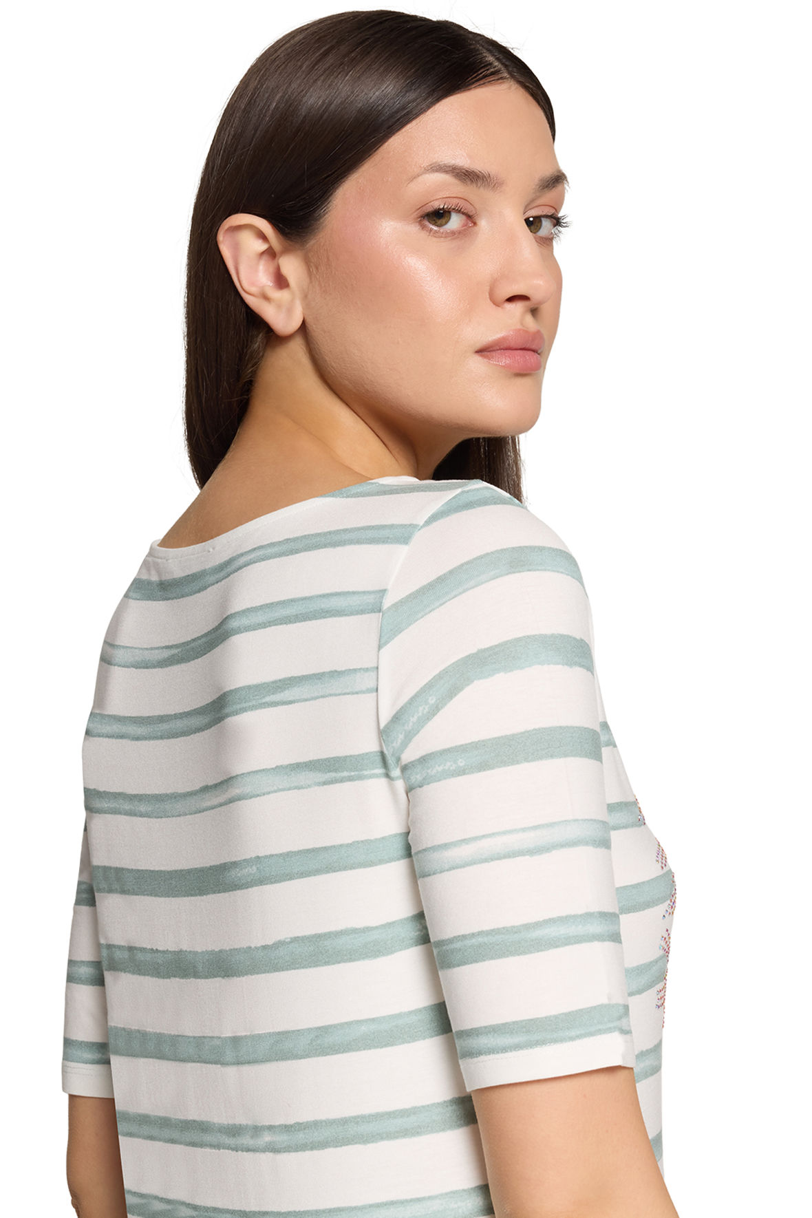 Stibet viskose t-shirt med bådhalsudskæring hvor de grønne striber er lavet som penselstrøg med vandfarve, det ser meget smukt ud. Brystet har fået similisten. Ærmerne er korte. Rigtig let og åndbar kvalitet og pasformen er løs.
