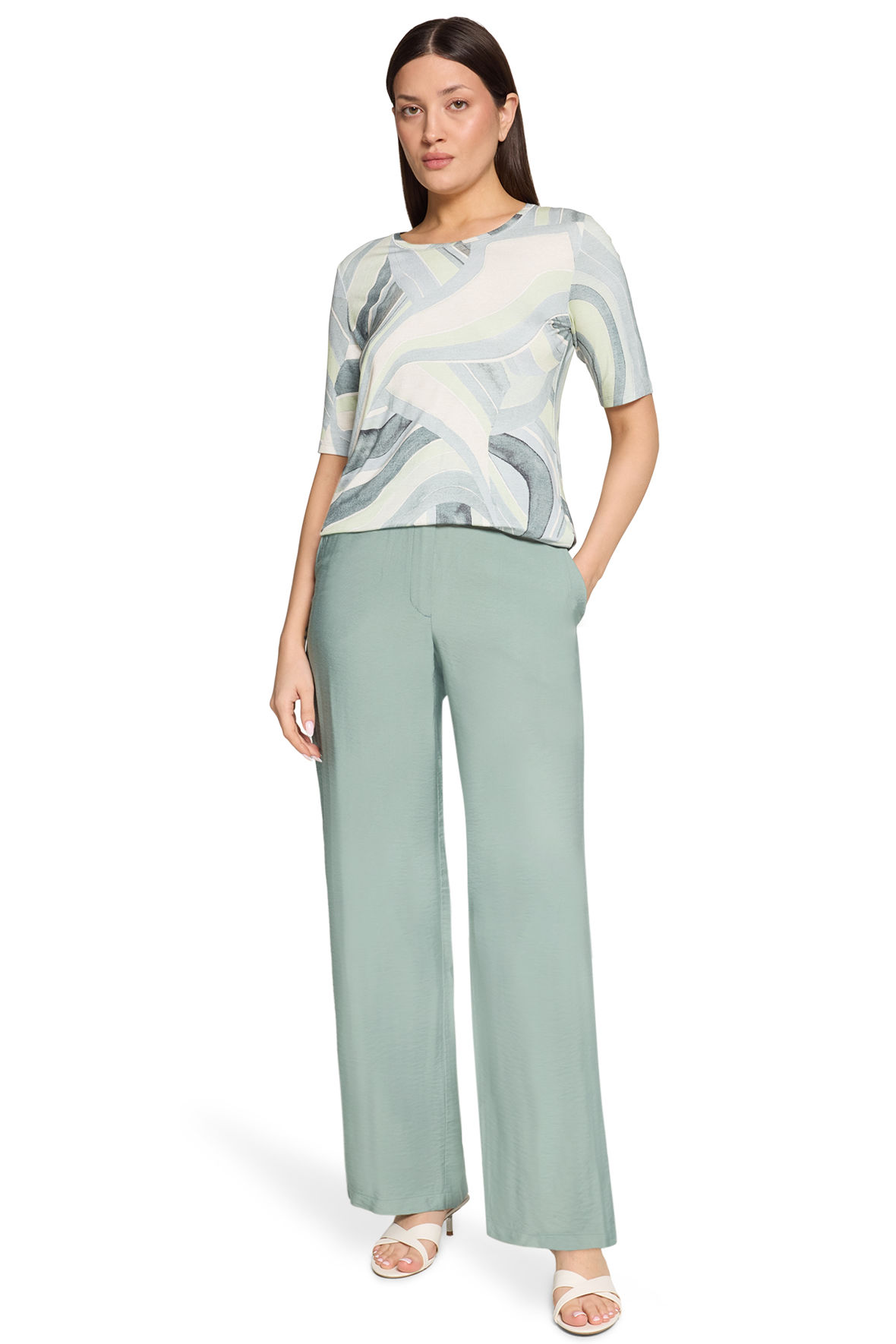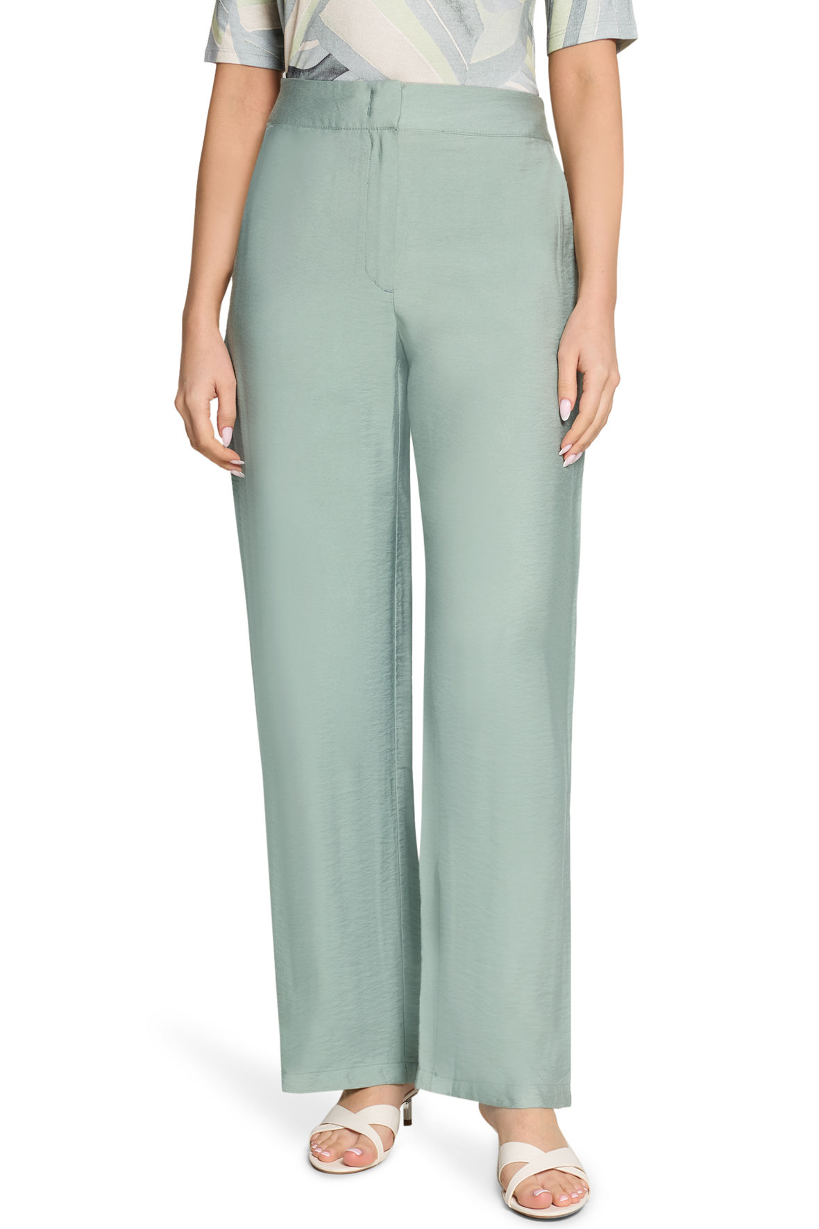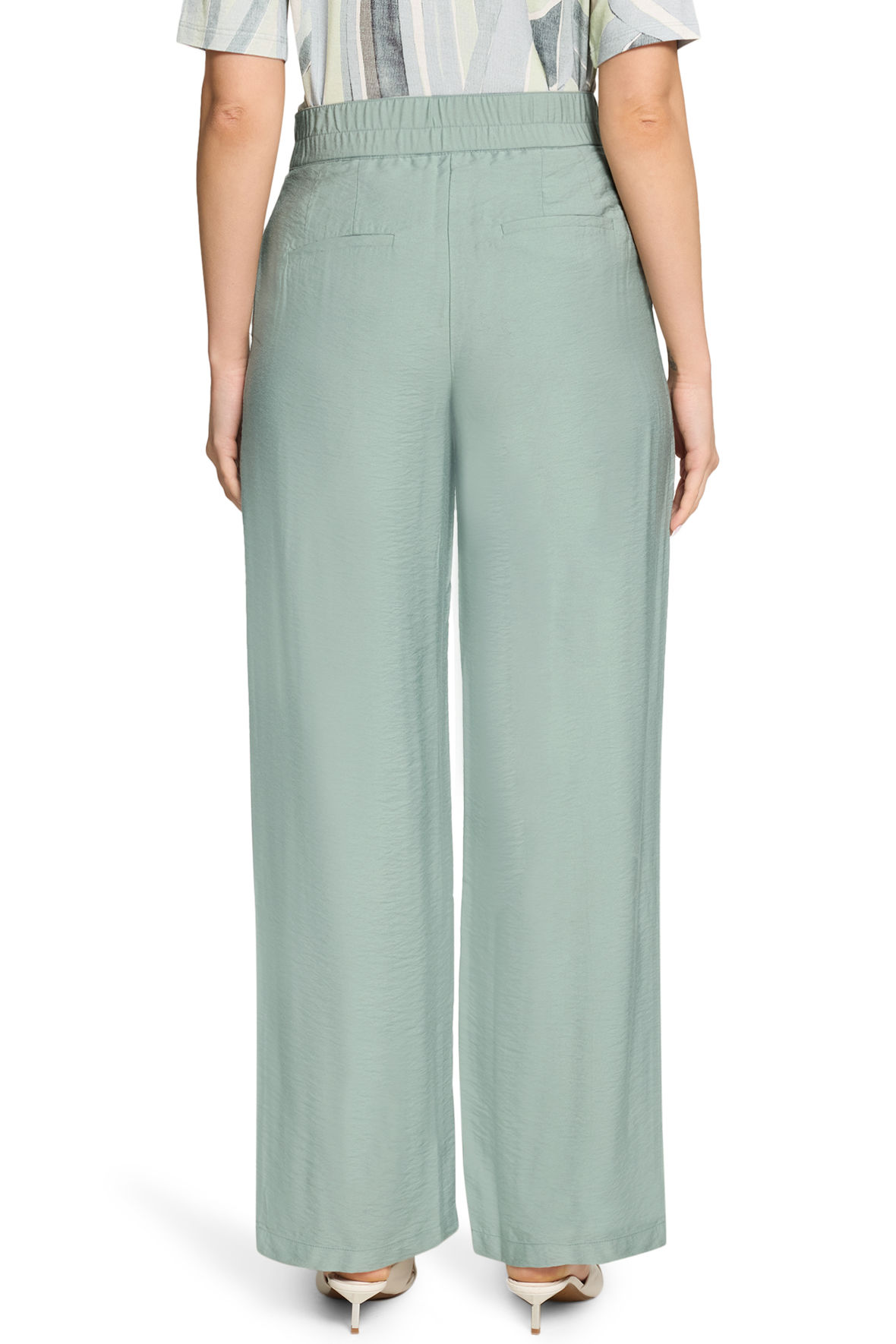 Flotte løse og meget lette viskose bukser i mintgrøn med crepe/hørlook. De har en rigtig lækker tekstur. Med bred linning der er fast fortil og som har elastik bagtil, det er smart og får den til at blive i den ønskede højde. De lukkes med to hægter samt knap og har også lynlås samt gylp. Franske lommer fortil og paspellommer til pynt bag. Taljen er høj og pasformen er en sommerlig loose fit. Og, igen en fantastisk model der med hæl giver et udtryk og flade sko et helt andet. Det er så smart alt i mens at du beholder det ekspressive look.
