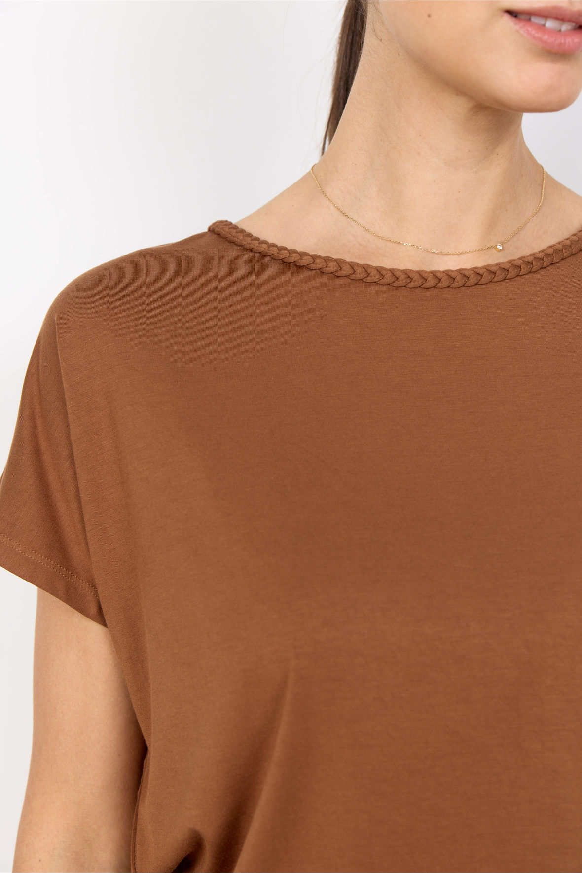 SC-MARICA 354 er en T-shirt fremstillet af 93 % lyocell og 7 % elastan, så den er blød og let samt åndbar. Den har en rund flettet krave og en afslappet pasform med drop down skulder og korte ærmer. Dejlig og casual til hverdagen.