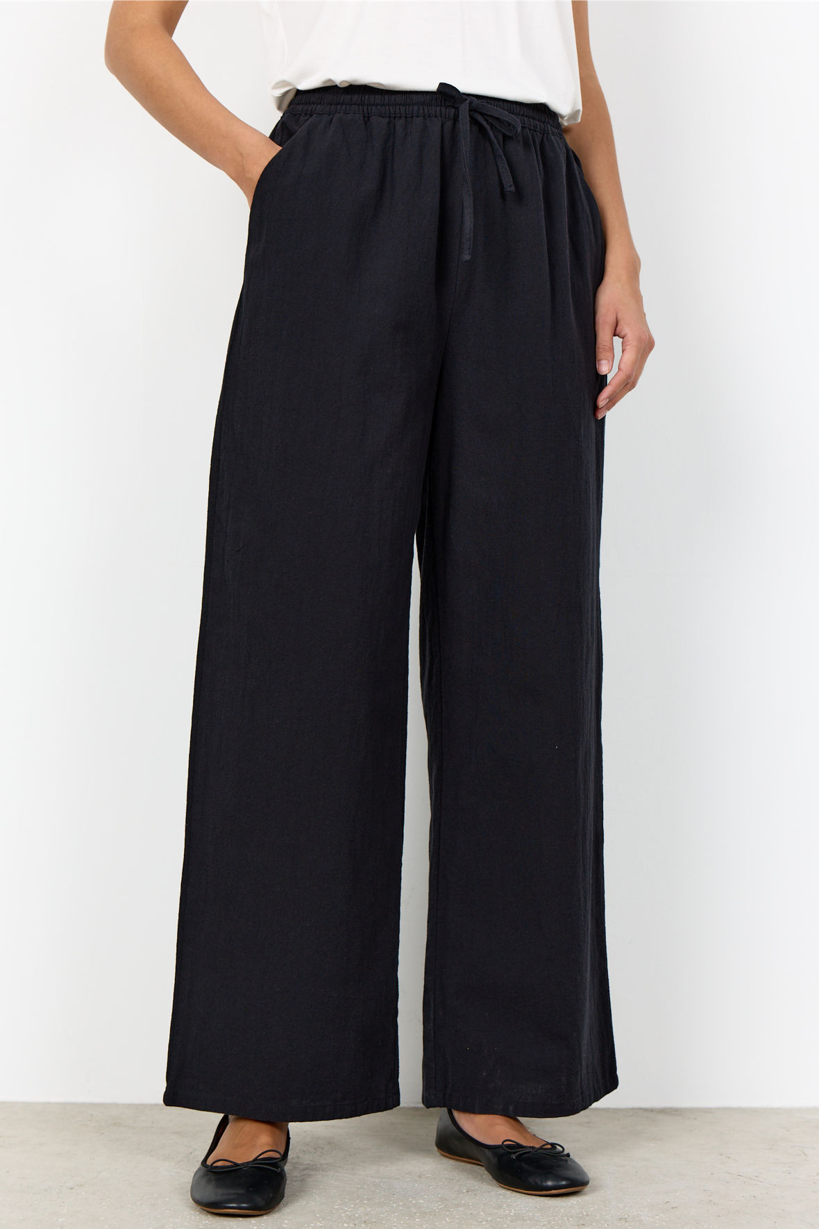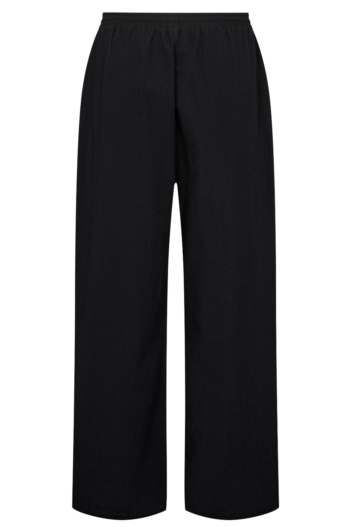 Løse bløde bukser med fuld længde i den vanlige - og for mange højt elskede bomulds kvalitet. Med bred elastisk linning med snører. De har skrålommer foran. Kvaliteten er let og sommerlig med ru overflade som også går for at være en "fattigmands hør". De har casual og løst snit. Sc-Cissie 49-c kommer jævnligt i flere farver - en gammel kending vi ved der sidder godt og falder i smag. Snittet er baggy hvis du trækker buksen ned, og det er der plads til for taljen er høj.