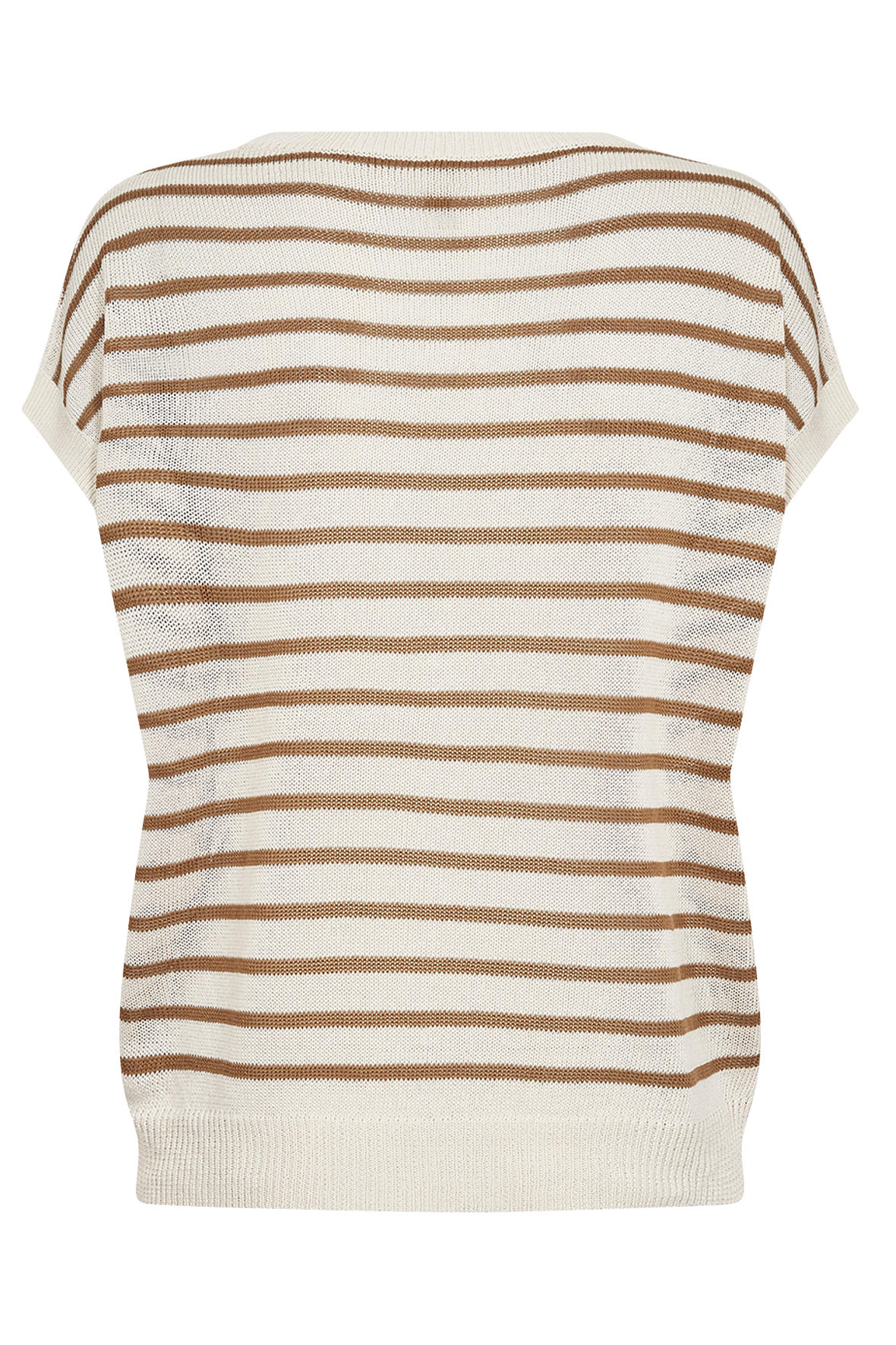 Er det ikke bare en sød strik, sc-Luanna er fint strikket som en sommerlet style. Med ribstrik på kanter, rund i halsen samt med drop down skuldre/vingeærmer. Oversize i kroppen så der er god plads. Gå sommeren i møde med lidt nyt. Den er åndbar. Flot beige med oliven striber.