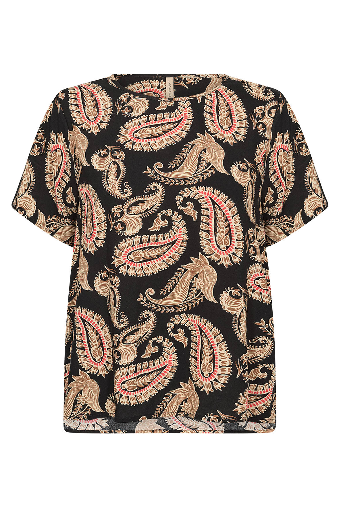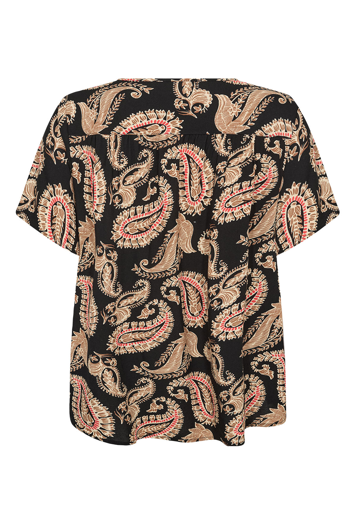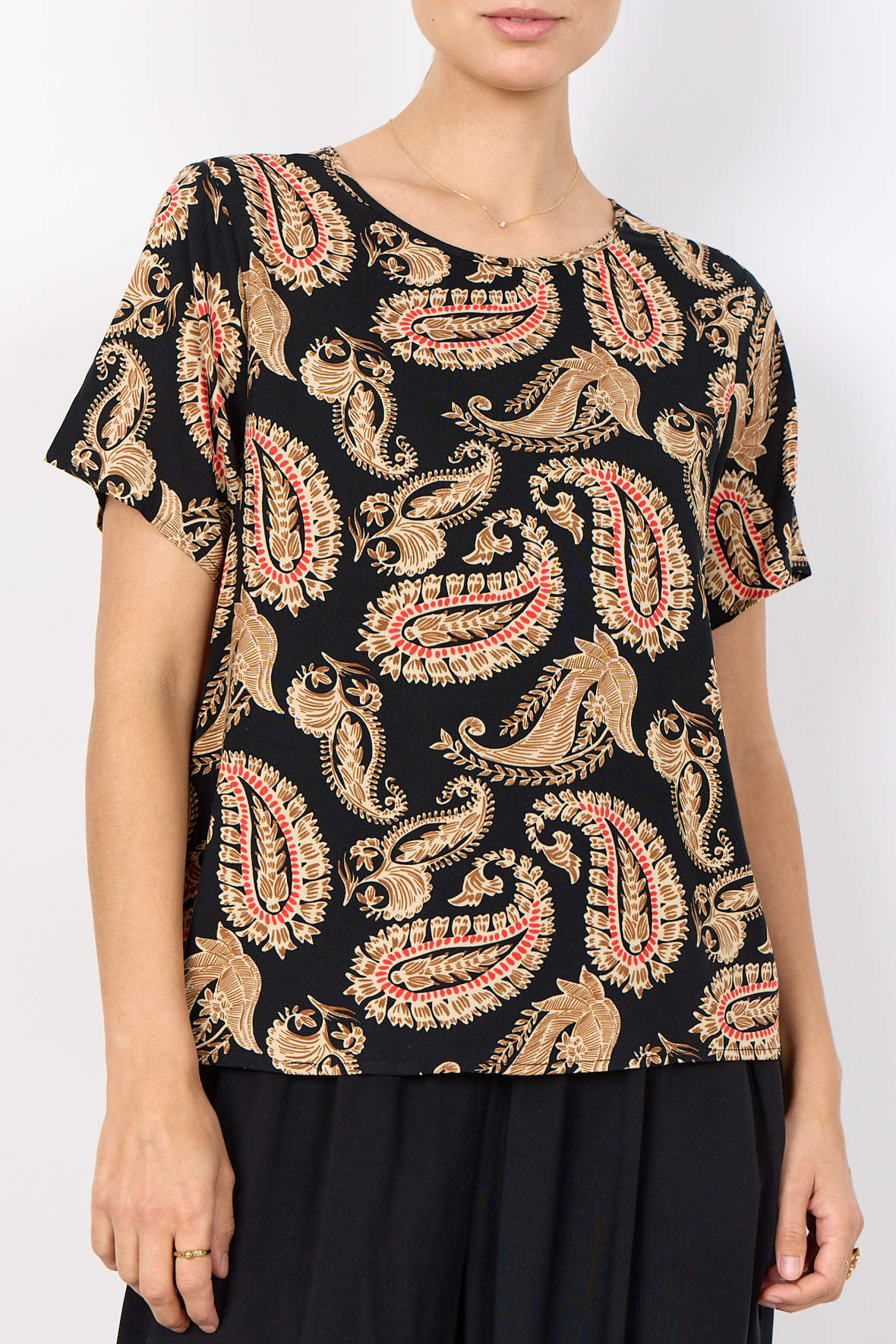 Sc-Falisha 2 blusen er fremstillet af ECOVERO™ Viskose. Den har en yndefuld rund halsudskæring, korte ærmer og et iøjnefaldende paisleyprint derr er sort i bunden. Den er ultra let og åndbar og bringer dig elegant igennem sommeren.
