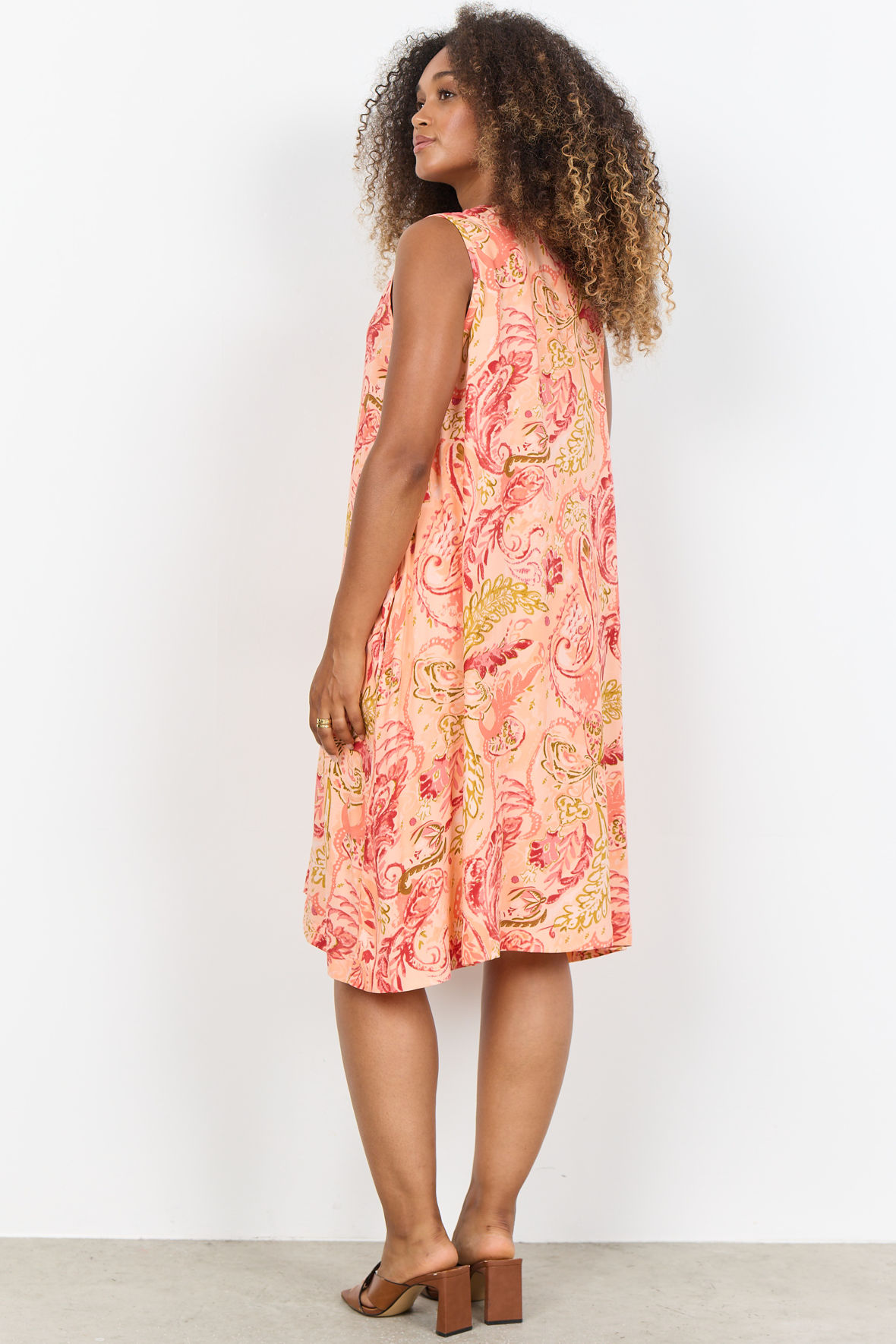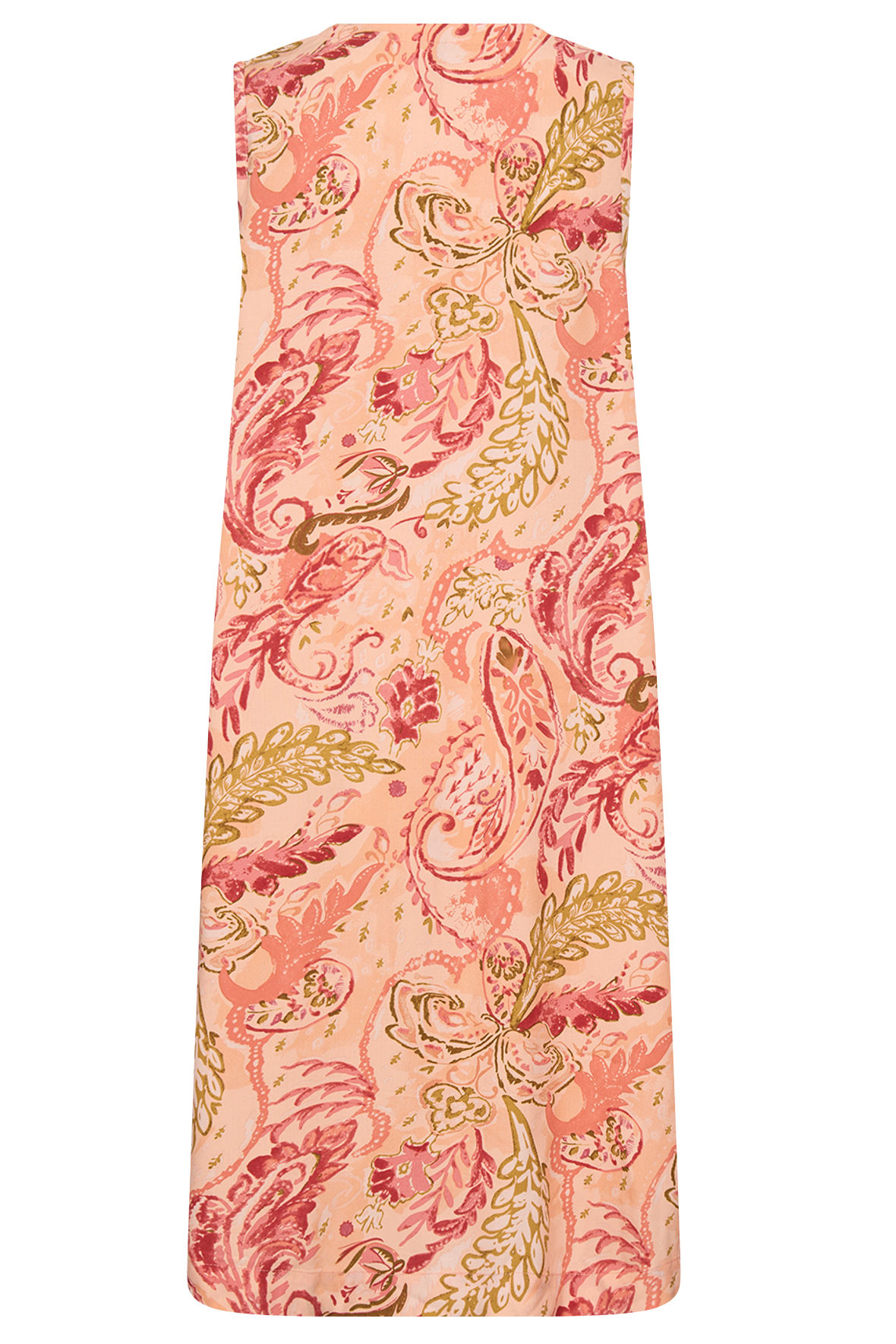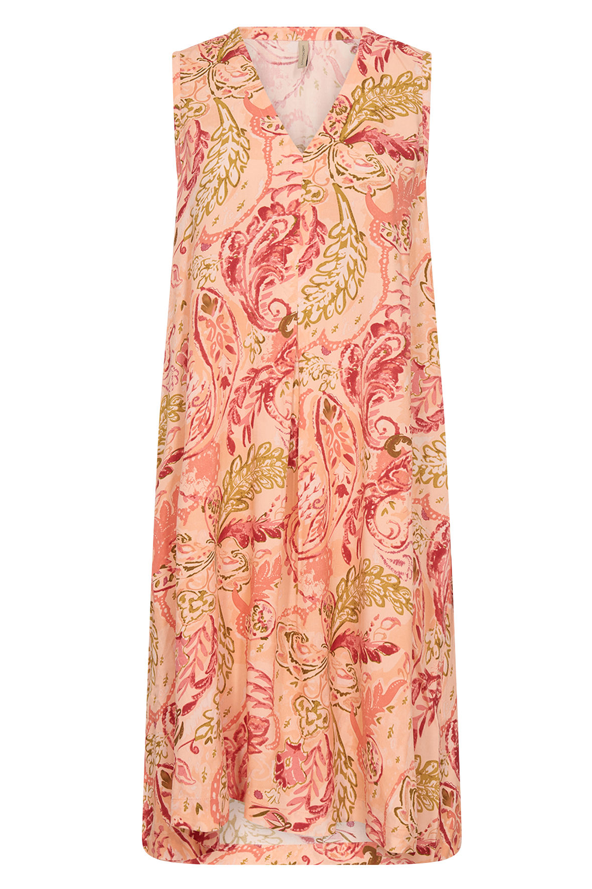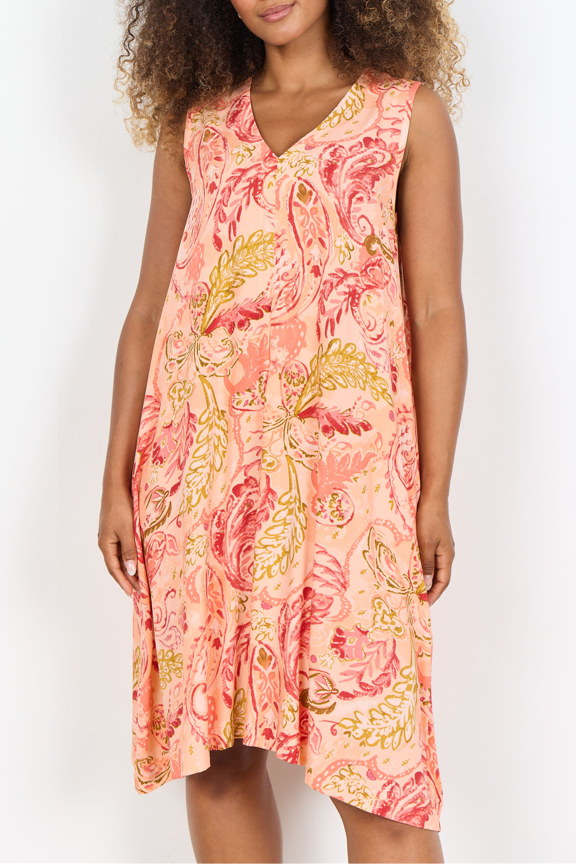 Utroligt sød laksefarvet Paisley print kole med længde til knæ. Sc-Faneth 4 er ærmeløs og har V-udskæring, der er lommer i sidesømmen. Den har lille læg ved maven som lige skaber lidt tryghed. Den er lavet i ren EcoVero viskose der er så dejlig en sommer kvalitet som er åndbar. Og, jeg tænker den gode pris hjælper den på vej.